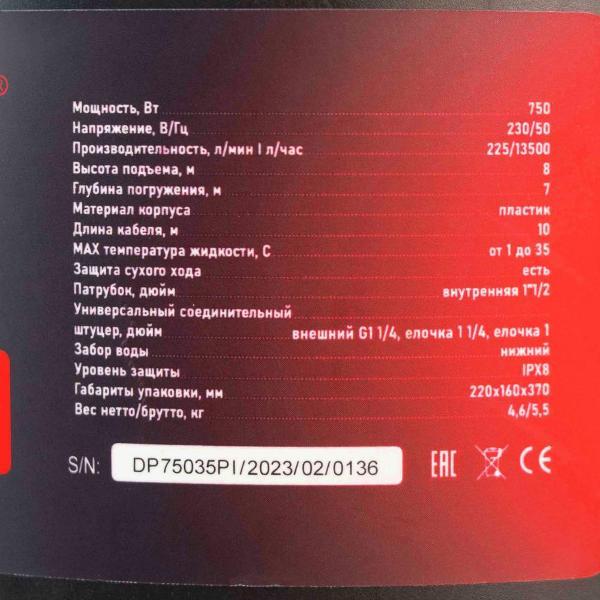 Способность пропуска воды достигает показателя 13,5 м³/ч при максимальном напоре 8 м и производительности 225 л/мин. Инструмент устанавливается вертикально на глубину до 7 м. Конструкция устройства включает в себя прочный пластиковый корпус с ручкой для переноски и сетевым шнуром длиной 10 м. Максимально допустимая температура воды составляет 35°С.