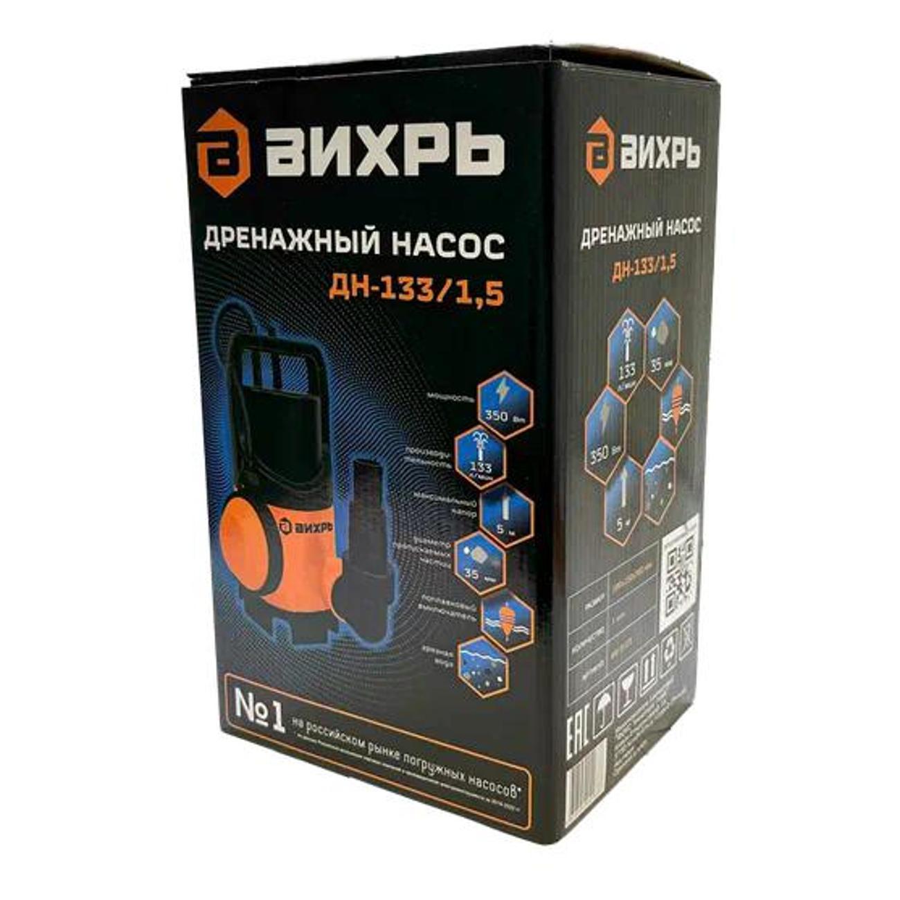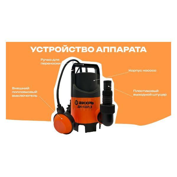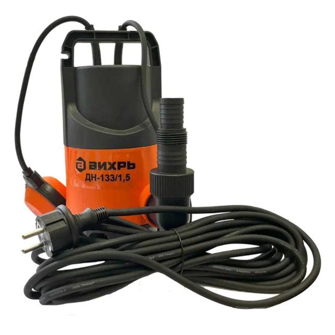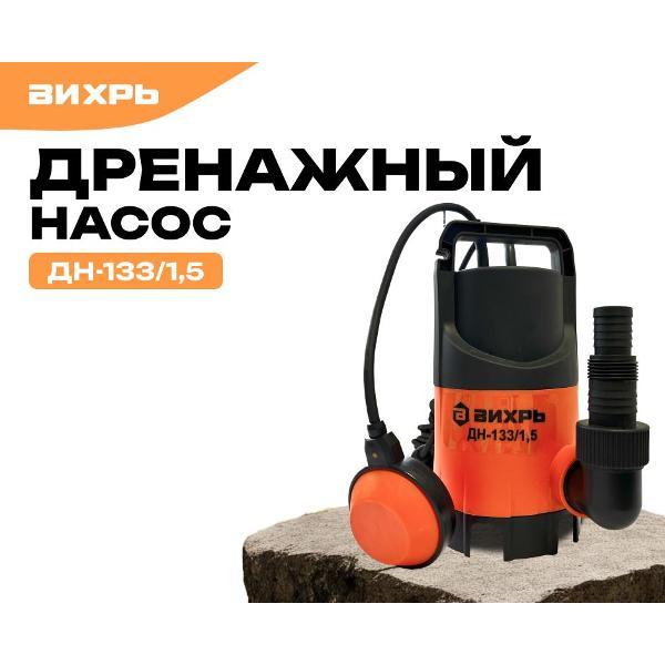 Дренажный насос «Вихрь» ДН-133/1,5 — погружное оборудование с асинхронным электромотором, которое обеспечивает быструю и эффективную перекачку воды. Номинальная мощность устройства составляет 350 Вт. Максимальный уровень напора достигает 5 м. Тип ротора — сухой. Устройство рассчитано на работу с грязной водой. В основе лежит вихревой механизм. Диаметр выходного отверстия равен 1,25". Глубина погружения достигает 9 м. Диаметр пропускаемых частиц — 35 мм.