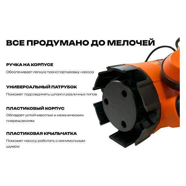 Степень защиты от внешнего воздействия соответствует значению IPX8. Корпус выполнен из ударопрочного пластика. Для безопасной и надежной эксплуатации насос снабжен системой защиты от перегрева и сухого хода. Установка устройства производится в вертикальном положении. Возможна работа при температуре окружающей среды от 1°C до 40°C. Максимальный уровень шума не превышает 60 дБ. Для подключения к источнику питания используется 8-метровый кабель. Цвет корпуса — оранжевый. Размеры модели составляет 30х19х19 см, вес — 1,8 кг.