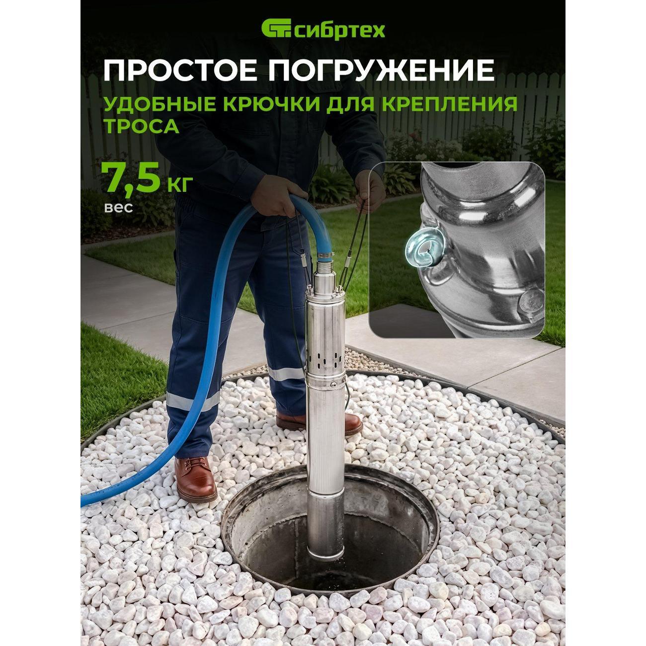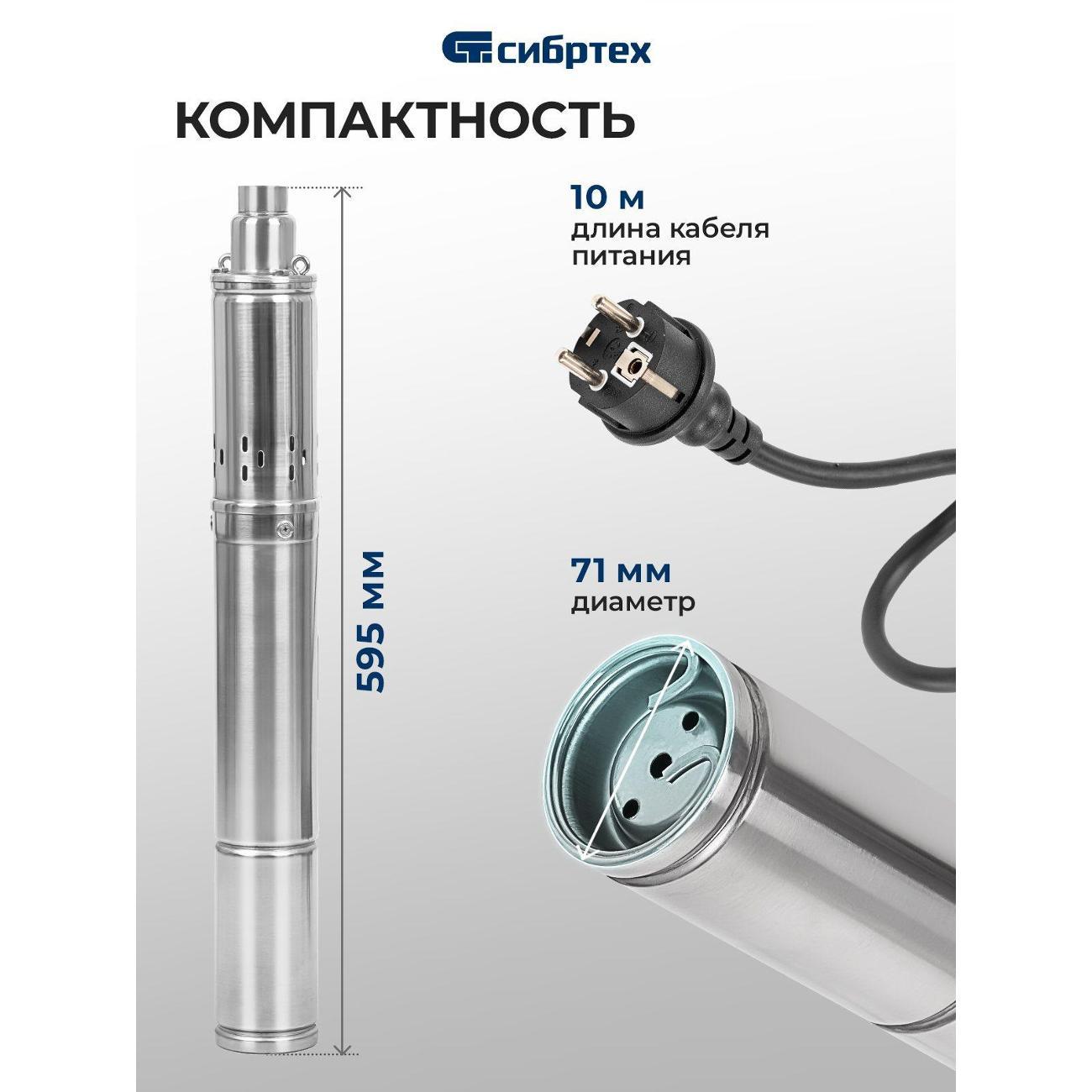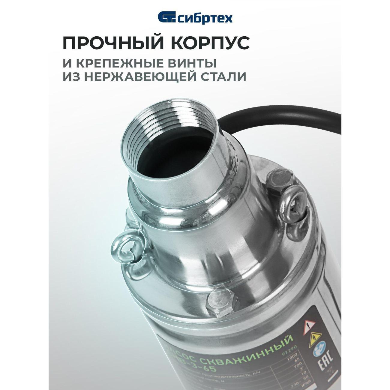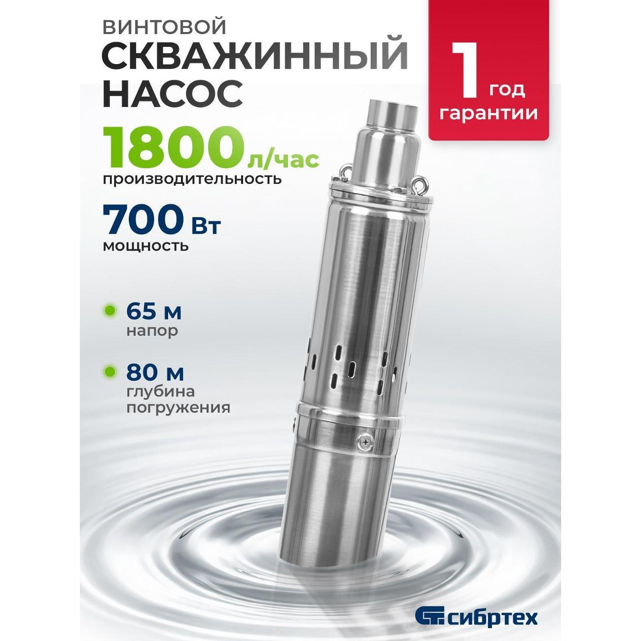 Скважинный насос «Сибртех» СНВ-3-65 предназначен для работы с чистой водой. Мощность устройства составляет 700 Вт, вода может подниматься на высоту до 65 м с производительностью 1800 л/мин. Корпус выполнен по стандарту защиты IPX8 и может быть погружен на 80 м. Насос оснащен винтовым механизмом, диаметр устройства — 72 мм. Асинхронный двигатель заполнен маслом, не требует обслуживания. Длина сетевого шнура составляет 15 м, подключение производится к электросети напряжением 220-230 В.