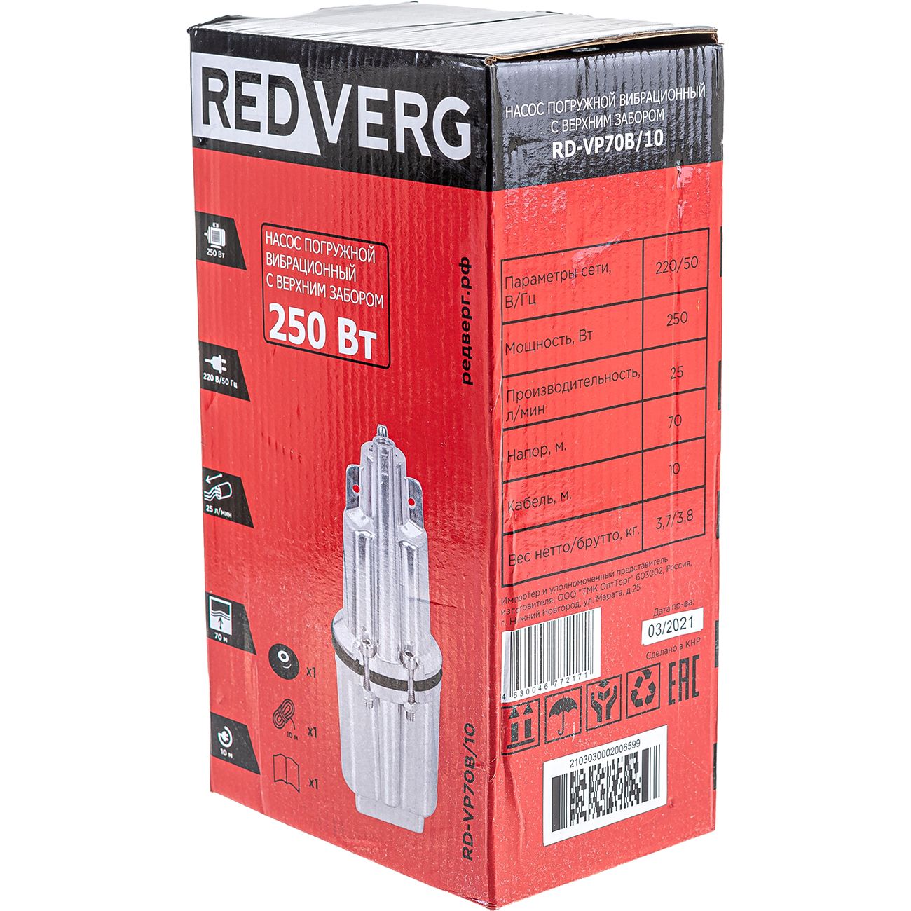 Вибрационный погружной насос Redverg RD-VP70B/10 для подъема воды из скважин и колодцев, диаметром от 100 мм. Модель оснащена мощным мотором на 250 Вт. Работает от электросети с напряжением 220 В. Максимальная глубина погружения — 4 м. Насос подает воду под напором 70 м. Производительность прибора — 25 л/мин. Модель снабжена кабелем длиной 10 м и вилкой для подсоединения к сети. В комплекте поставляется резиновый поршень (мембрана). Габариты устройства: 110 х 300 х 170 мм. Вес без упаковки — 3,4 кг.