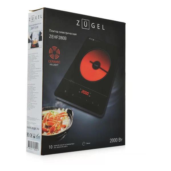 Настольная электрическая плита Zugel ZEHF280B в корпусе черного цвета оснащена встроенной защитой от детей и защитой от перегрева. На варочной панели располагается одна конфорка (Hi-Light) диаметром 20 см. Она выдерживает максимум 8 кг. Управление моделью сенсорное. Спереди на корпусе располагается LED-дисплей, где отображаются выставленные настройки мощности и температуры. Также присутствует индикация остаточного тепла. Энергопотребление плиты составляет 2000 Вт. У модели десять уровней регулировки температуры. Предусмотрен таймер на 180 минут.