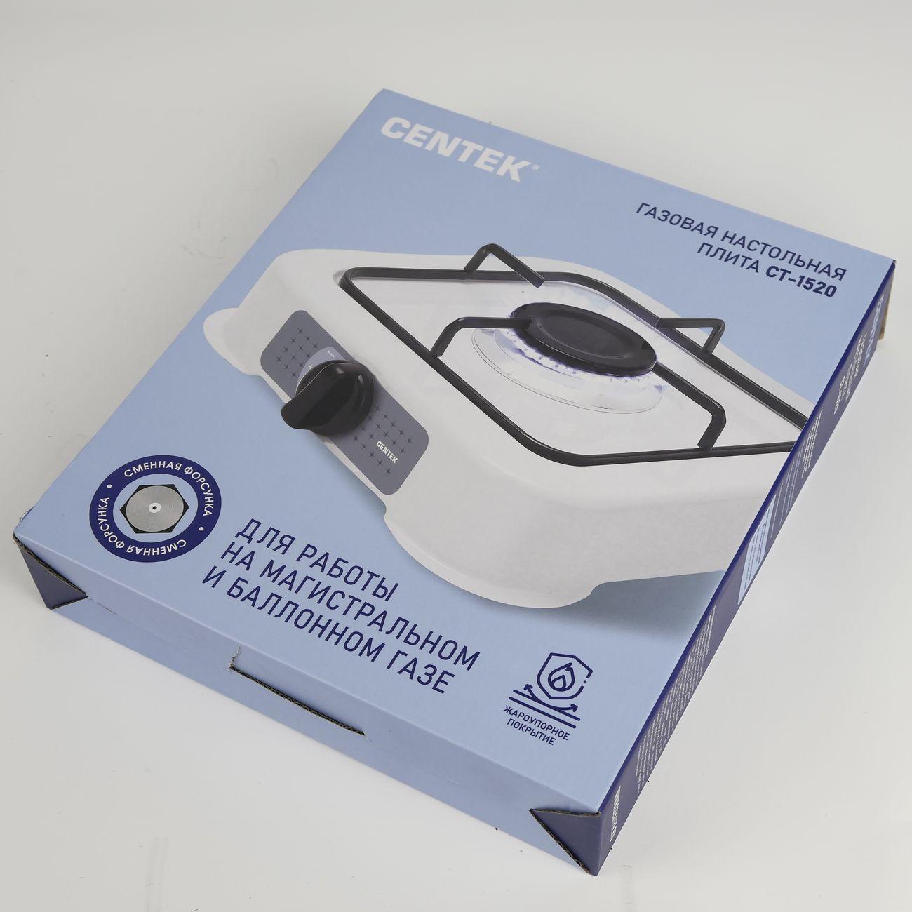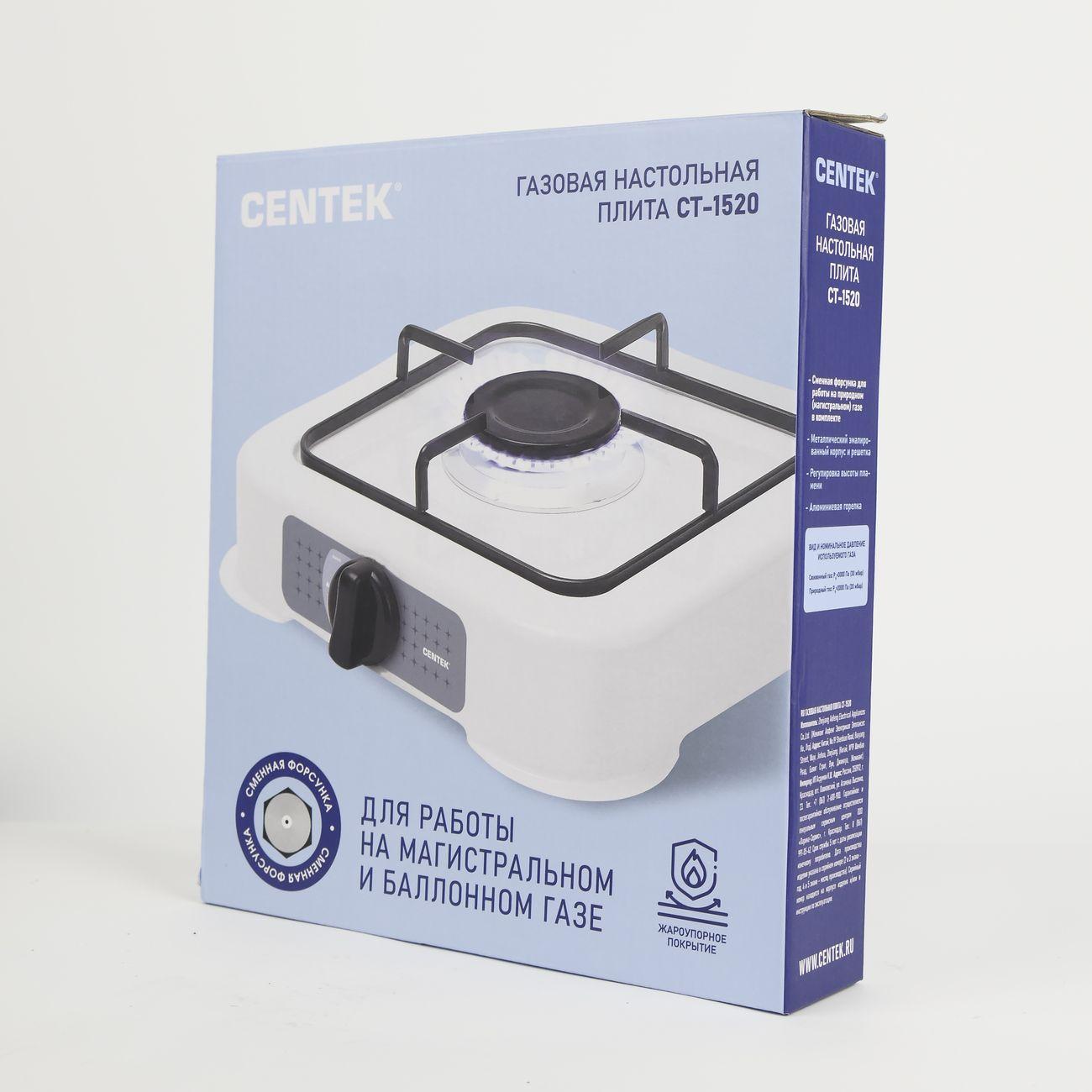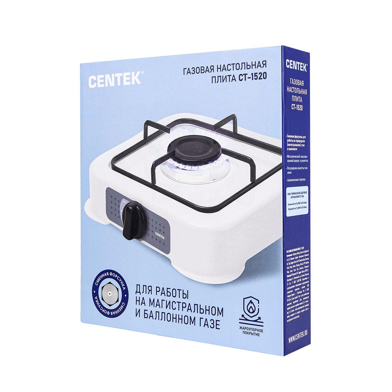 Настольная газовая плита Centek CT-1520 оснащена одной конфоркой. Компактные габариты (высота — 10 см, ширина — 30 см, глубина — 35 см) позволяют без труда разместить прибор в небольшом помещении, а небольшой вес (2 кг) обеспечивает мобильность и легкость транспортировки. Прибор может работать от газового баллона, поэтому оптимален на даче или в походе.