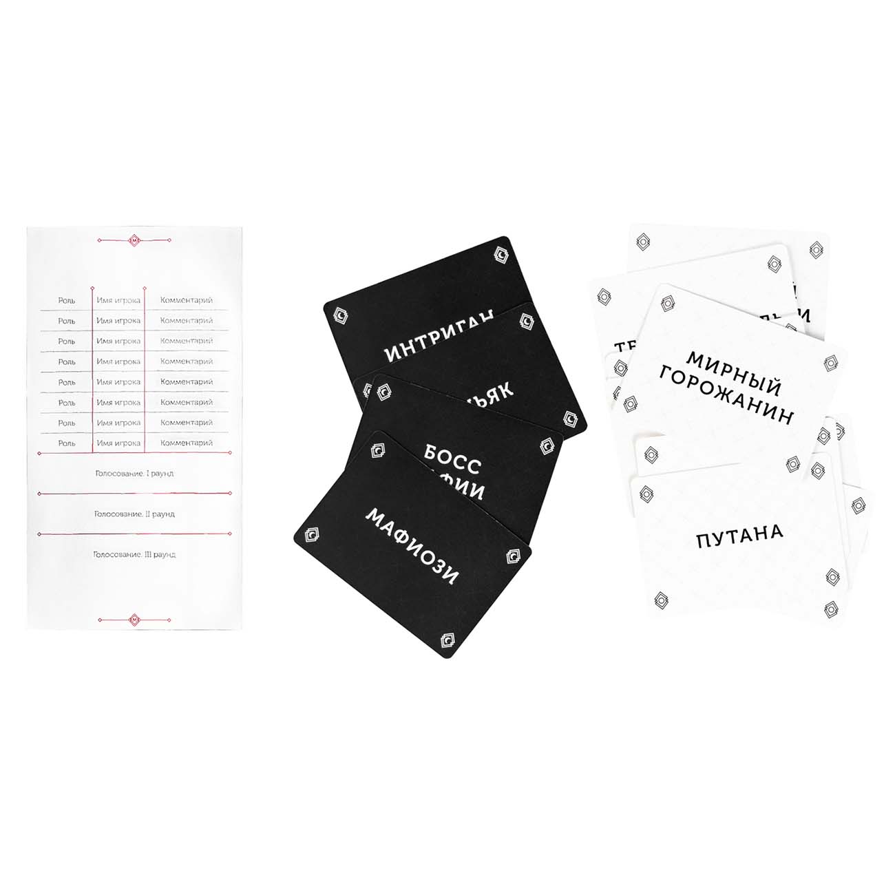 Основной принцип сохранился прежним: «город засыпает, мафия просыпается». Но все элементы выполнены так, что оппонент не поймёт, какая роль досталась вам, даже если попытается подсмотреть сбоку. Кроме 19 привычных персонажей, в набор добавлены три новых: телохранитель, шериф и журналист.