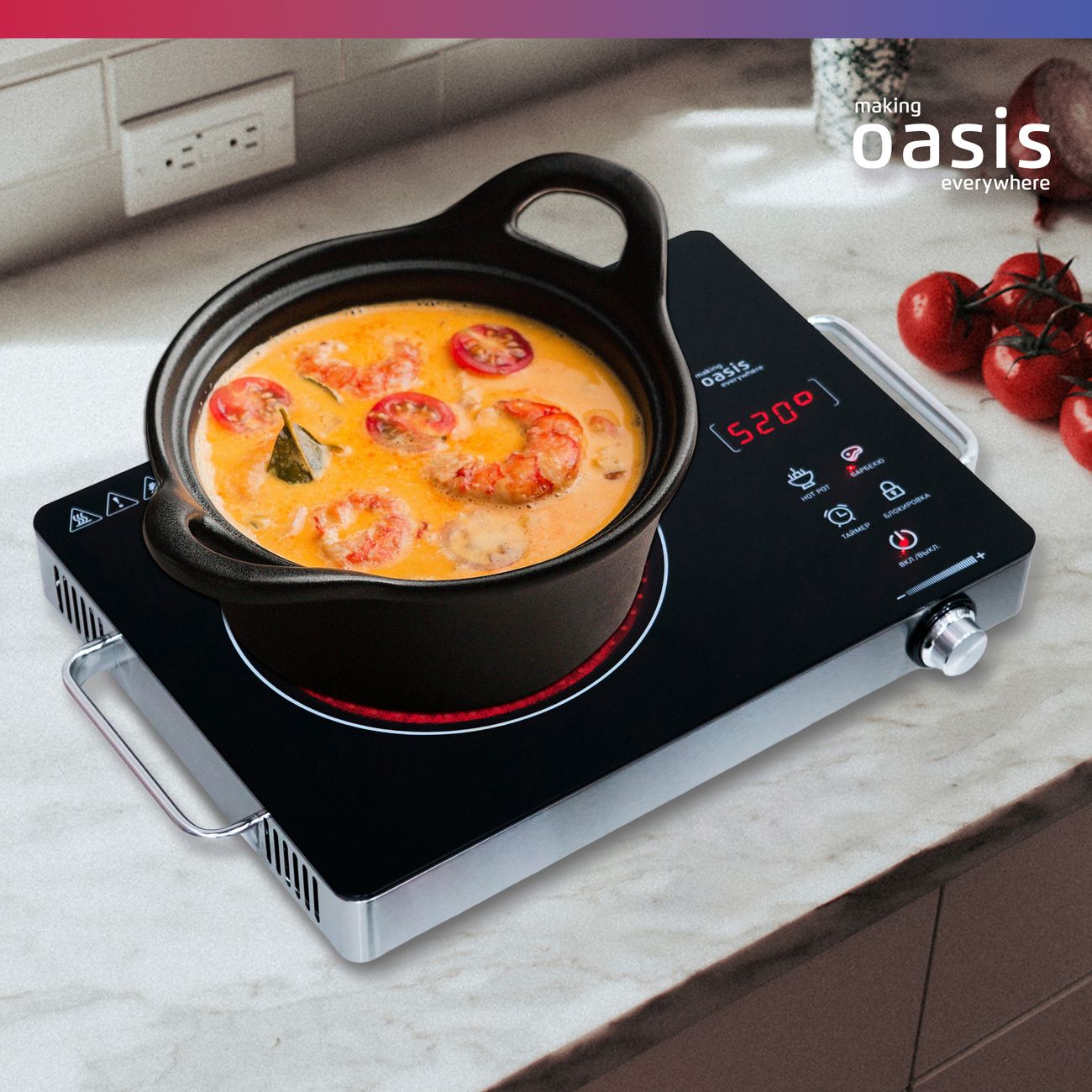 Настольная инфракрасная плита making Oasis everywhere A-TS1S отлично подойдет для дачи, общежития, или небольшой кухни. Прибор легко перемещать - по бокам корпуса предусмотрены ручки. Модель оснащена одной конфоркой диаметром 20 см и мощностью 2 кВт.