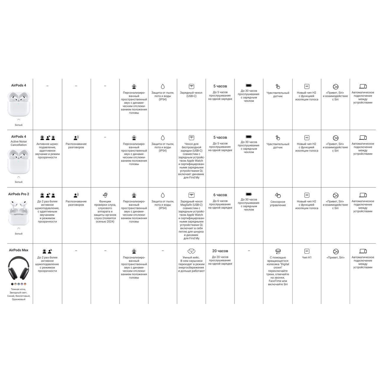 Наушники Apple AirPods 4 (MXP63) подсоединяются к смартфону без проводов, через Bluetooth-интерфейс 5.3. Белый пластиковый корпус защищен от попадания воды, класс влагозащиты — IP54. Модель отслеживает положение головы благодаря встроенному акселерометру и автоматически подстраивает звучание для получения наиболее чистого и выразительного звука.
