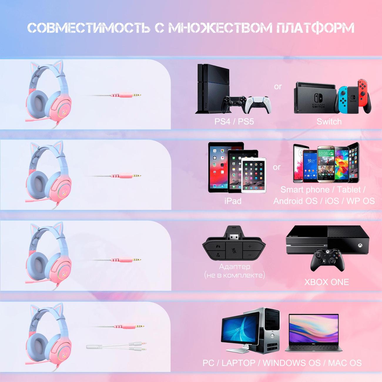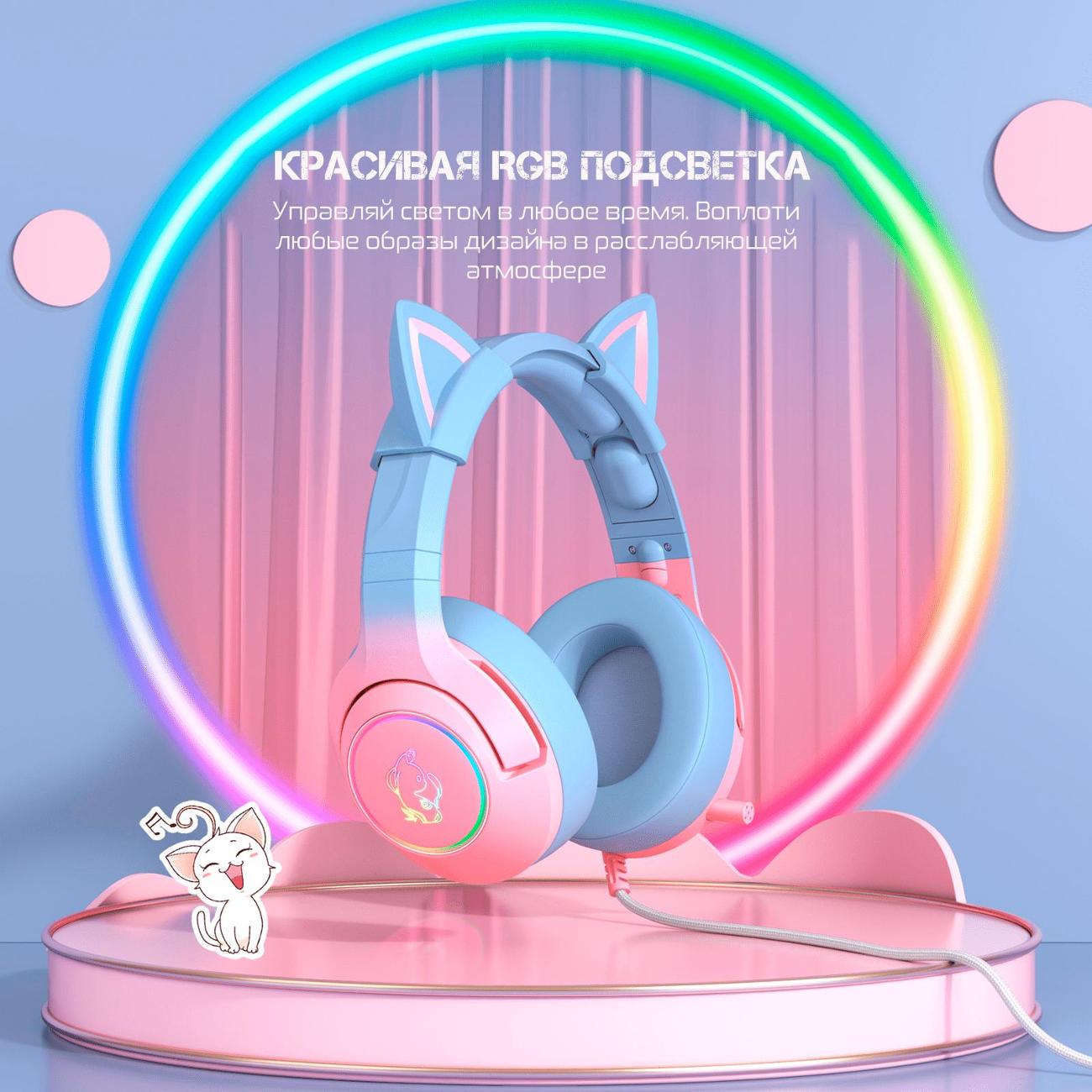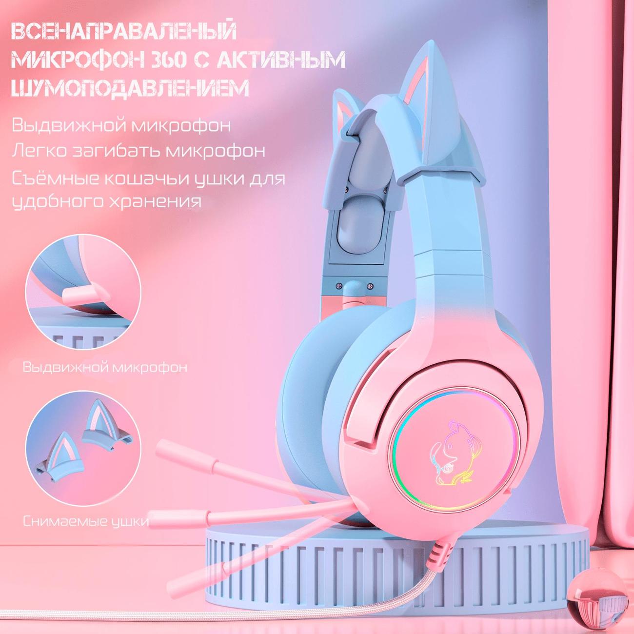Игровые наушники Onikuma Lilac Cat K9-PB обладают большими амбушюрами с эффектом памяти, выполненными из искусственной кожи, которые охватывают все ухо, плотно прилегают и исключают возникновение посторонних звуков. Корпус произведен из металла и пластика высокого качества. К дополнительной возможности относится встроенная яркая подсветка, которая осуществляет автоактивацию во время подключения модели посредством USB-штекера.