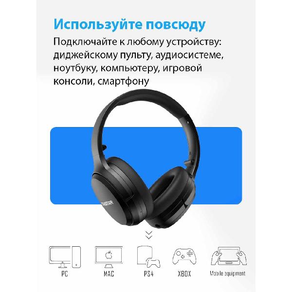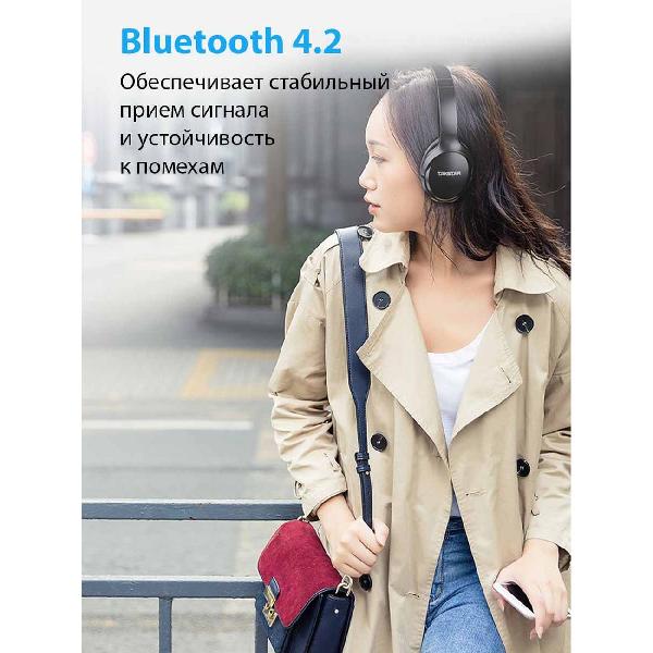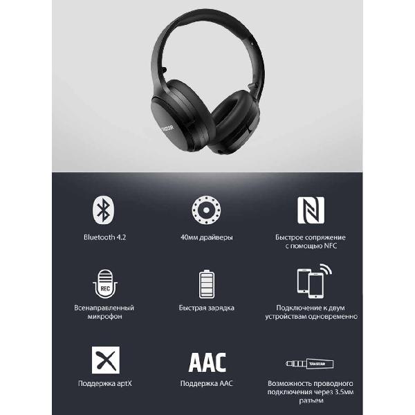 Устройство может одновременно подключаться к двум девайсам через интерфейс Bluetooth 4.2 с дальностью действия 10 м. Прибор поддерживает сопряжение с помощью NFC. Ресурса интегрированного аккумулятора хватает на 25 часов автономности в режиме ожидания. Изделие поставляется с аудиокабелем, зарядным проводом microUSB и чехлом. Корпус изготовлен из пластика, стойкого к износу и механическим повреждениям. Вес равен 239 г.