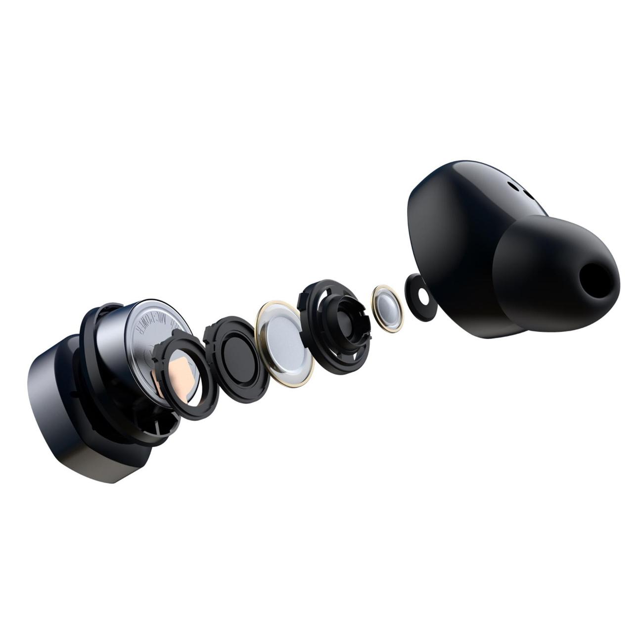 Встроенный микрофон создает возможность использовать устройство в качестве гарнитуры. В комплектацию включены кабель Type-C, футляр с зарядным устройством, чехол. Пластиковый черный корпус защищен от влаги. Амбушюры выполнены из силикона. Присутствует управление воспроизведением. Модель оснащена системой активного шумоподавления. Электропитание происходит за счет аккумулятора Li-Ion емкостью 500 мА*ч, время работы составляет 30 ч. Общая масса — 52 г.