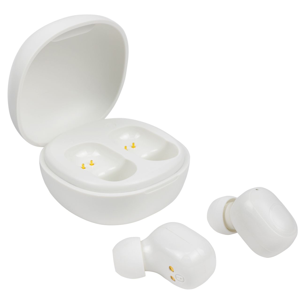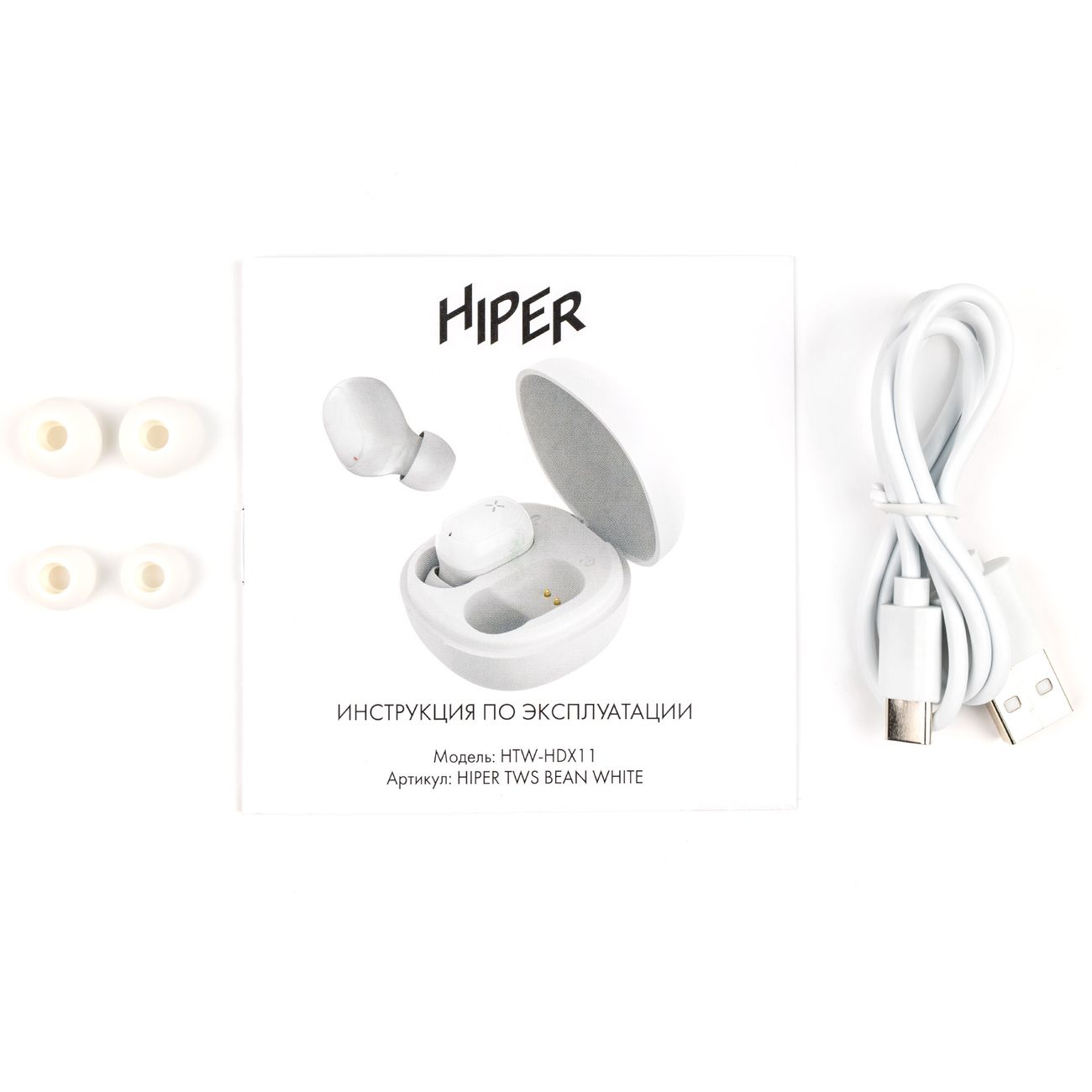 Время непрерывной работы от встроенного аккумулятора — до 5 часов, в режиме ожидания — 180 часов. Для зарядки используют футляр с емкостью батареи 250 мА*ч. В набор поставки входят кабель USB Type-C и три пары силиконовых амбушюр, позволяющих подобрать комфортный для ушной раковины вариант. Корпус изготовлен из пластика белого цвета. Вес — 30 г.