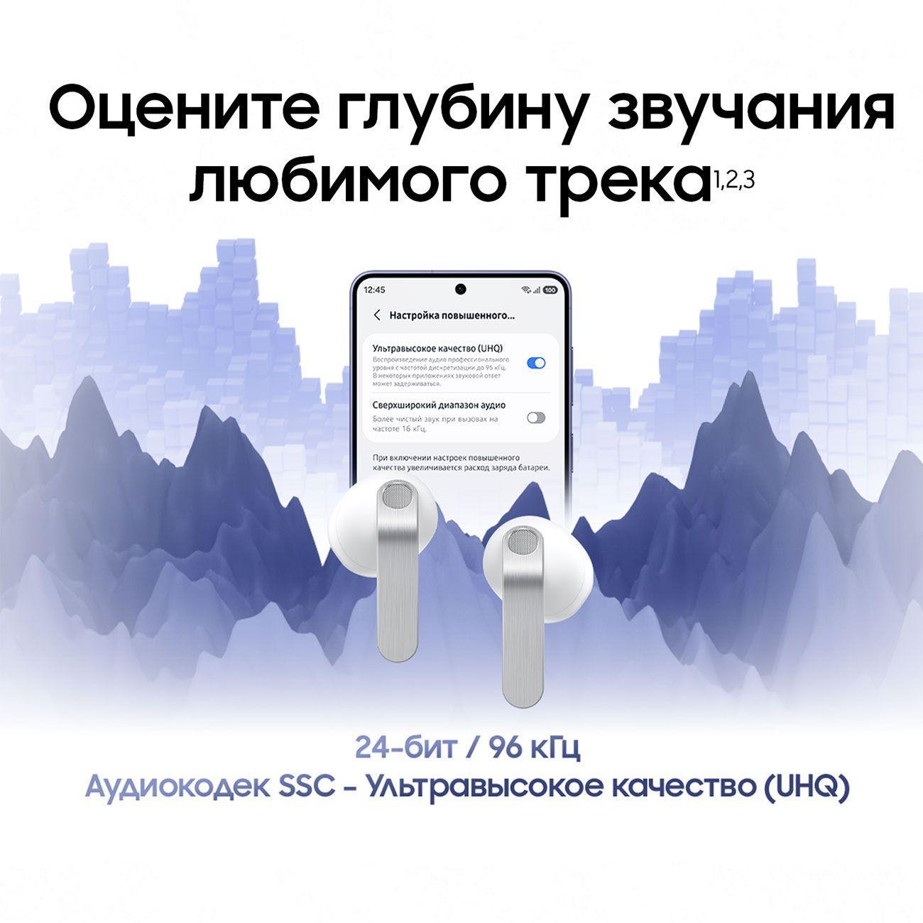 Наушники True Wireless Samsung Galaxy Buds 4 белые — беспроводная гарнитура открытого типа в футуристичном дизайне с металлическими вставками, предлагающая сбалансированное звучание и интеграцию с искусственным интеллектом.