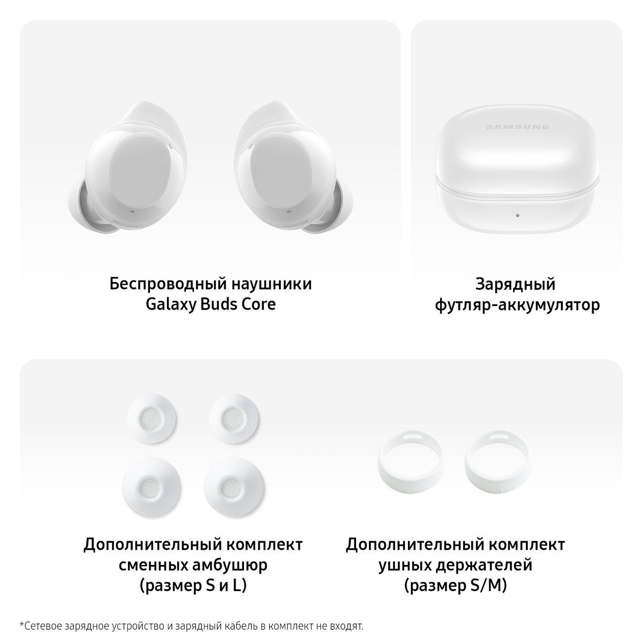 Беспроводные наушники True Wireless Samsung Galaxy Buds Core белые — внутриканальное устройство закрытого типа с поддержкой интеллектуальных функций и системы активного поглощения внешних шумов.