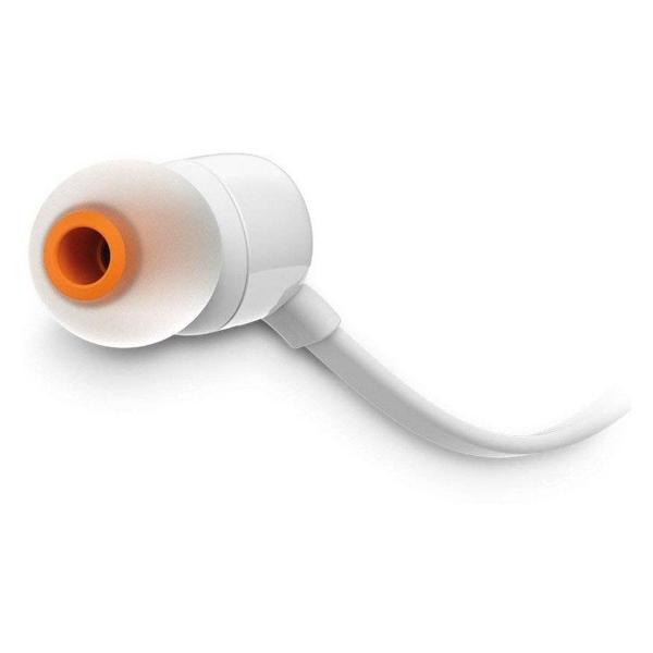 Наушники-вкладыши JBL T160 белого цвета весят 0,15 г и подключаются к смартфону или другим внешним носителям кабелем длиной 1,2 м, что обеспечивает свободу движений. Амбушюры из силикона мягко, но плотно прилегают к ушным раковинам, не причиняя дискомфорта. В комплекте идет запасная пара. Модель чувствительностью 100 дБ функционирует в частотном диапазоне 20-20000 Гц, поэтому можно слушать любые композиции в высоком качестве. Встроенный микрофон дает возможность говорить по громкой связи, принимать и отвечать на звонки. На шнуре располагается кнопка управления воспроизведением.