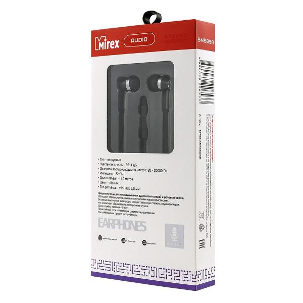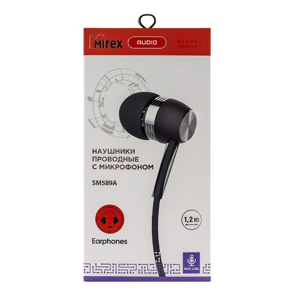 Наушники-вкладыши Mirex SM589A внутриканального закрытого типа выполнены из пластика черного цвета. Силиконовая оболочка кабеля защищает их от повреждений и препятствует перелому в местах сгиба. Модель оснащена микрофоном, позволяя пользоваться наушниками как гарнитурой. Управление воспроизведением осуществляется через переключатель, который находится на кабеле. Диаметр динамика — 9 мм. Сопротивление — 32 Ом. Чувствительность — 94 дБ. Частотный диапазон — 20–20000 Гц. Длина кабеля — 1,2 м. Вес — 60 г.