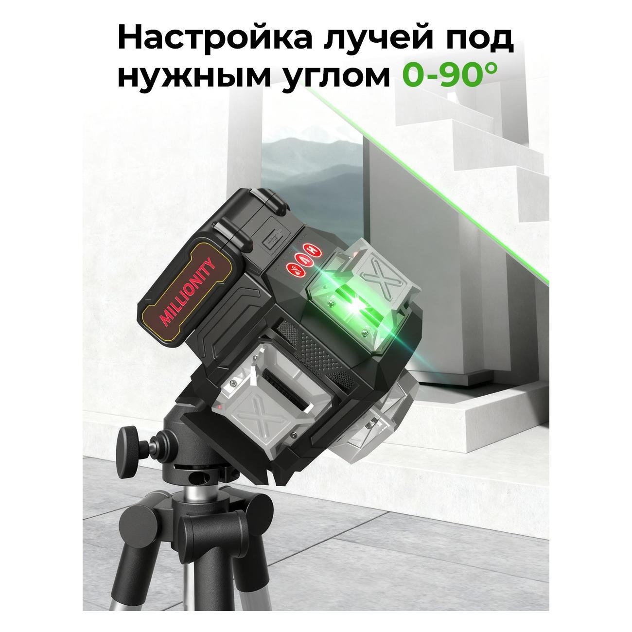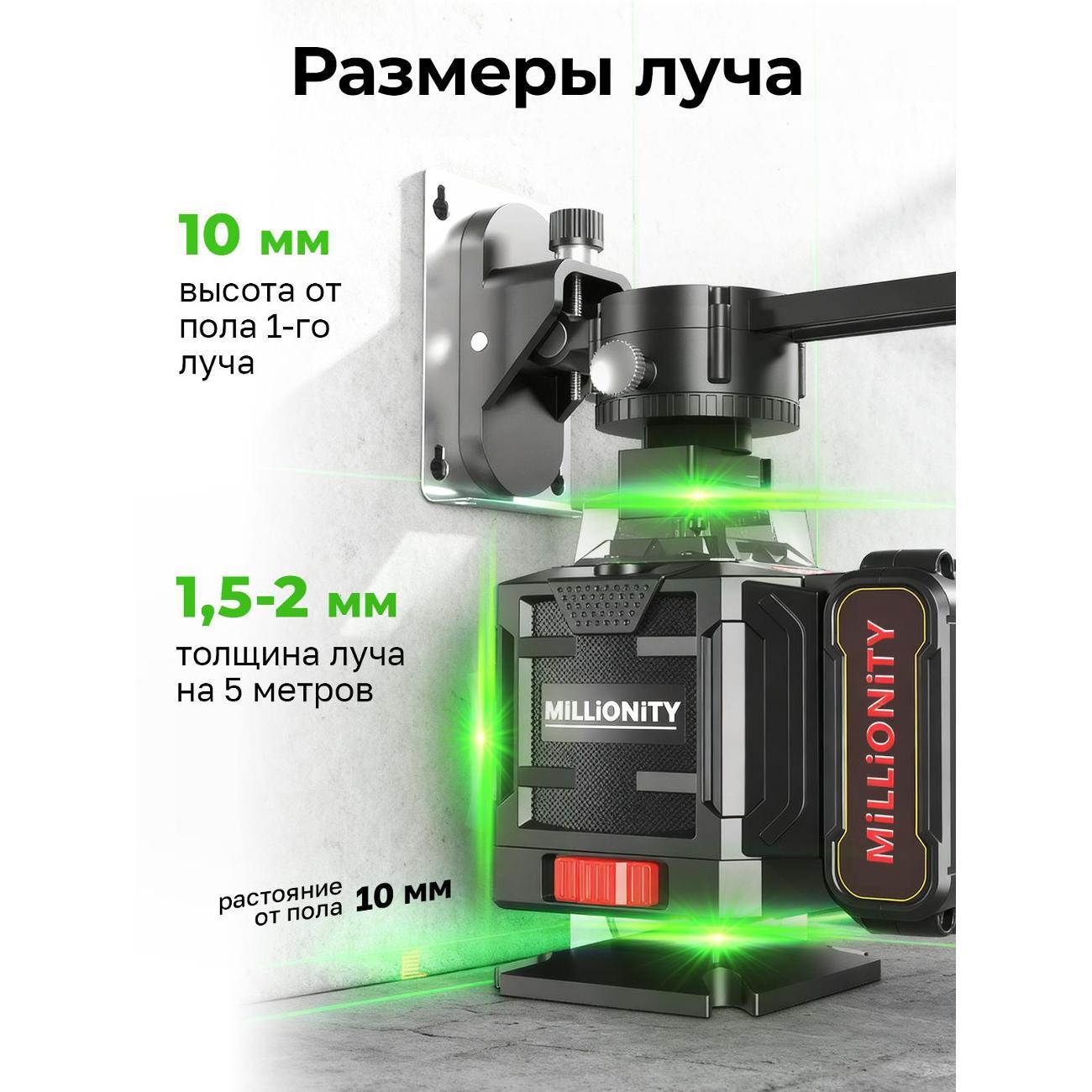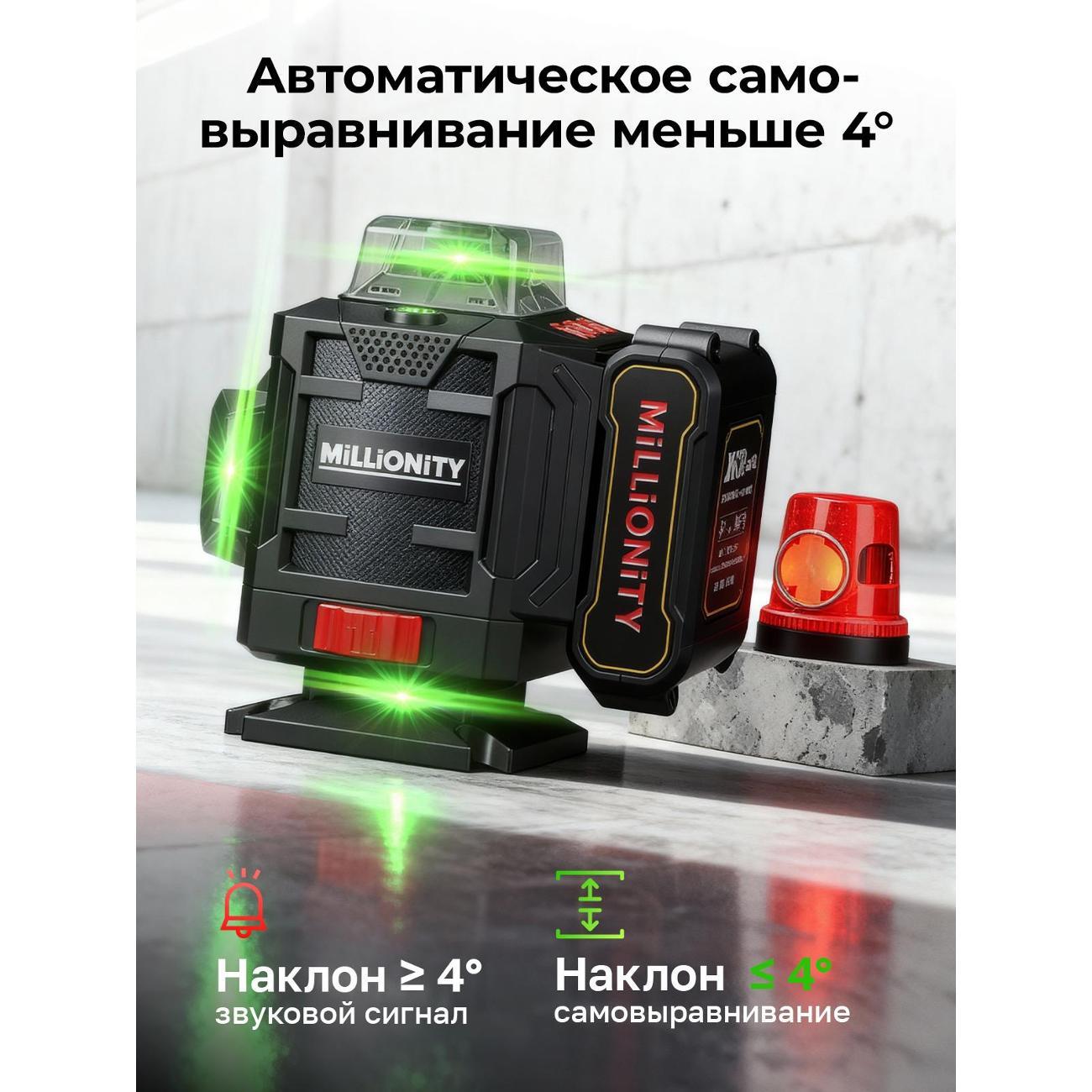 Лазерный уровень Millionity MKE-Black — самовыравнивающийся электронный прибор, который предназначен для внутренней отделки помещений, установки оборудования, выравнивания стен и пола, установки потолочных конструкций, перегородок и монтажа настенного оборудования, нивелировки настенных полок и другое.