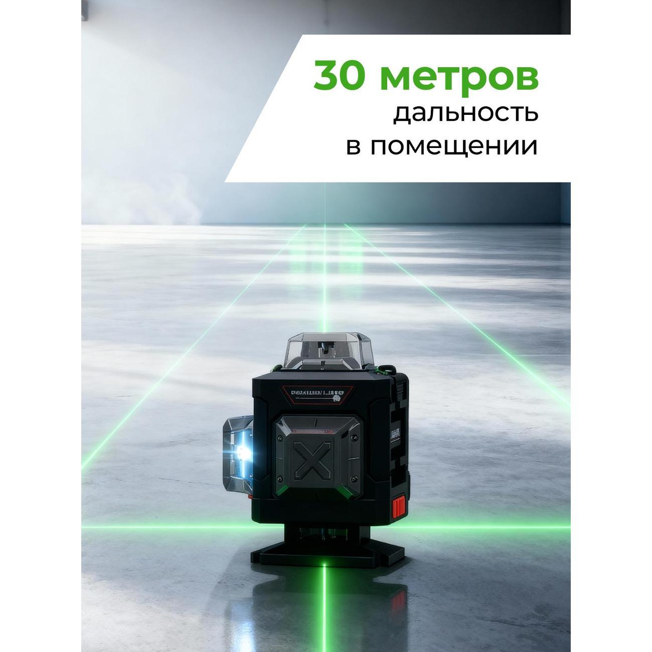 Работает под углом 360 градусов. Имеет 16 зелёных линий. С помощью них можно создавать в пространстве визуальные плоскости до 30 метров, что позволяет использовать его как для мелких работ, так и для больших проектов.