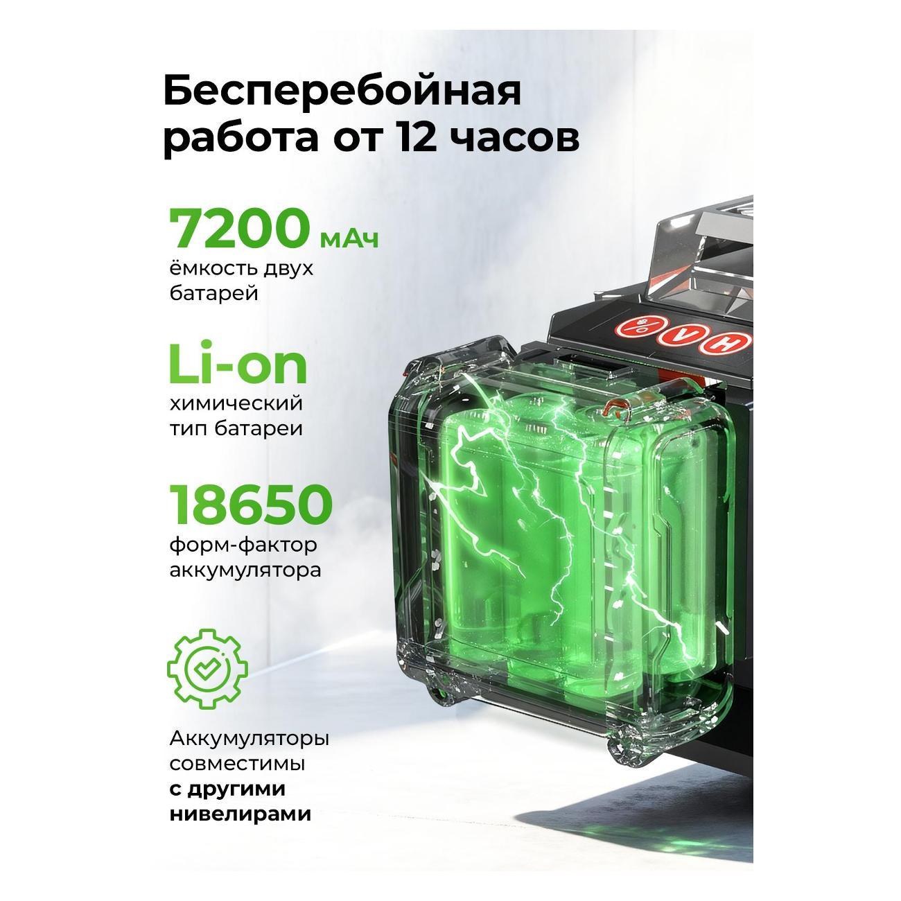 Лазерный уровень имеет несколько режимов работы. При его включении загорается цифровой дисплей с индикатором заряда. Нажимая кнопки Н и V вы можете выбрать соответствующие лазерные линии. Мощный луч, который проецирует линии на потолочную и стеновые поверхности. Также он оснащён зелёным лазером, что делает его более точным и видимым в условиях яркого освещения. Имеет регулируемую подставку (основание), которая позволяет установить его настойке, трипод или на штативе.