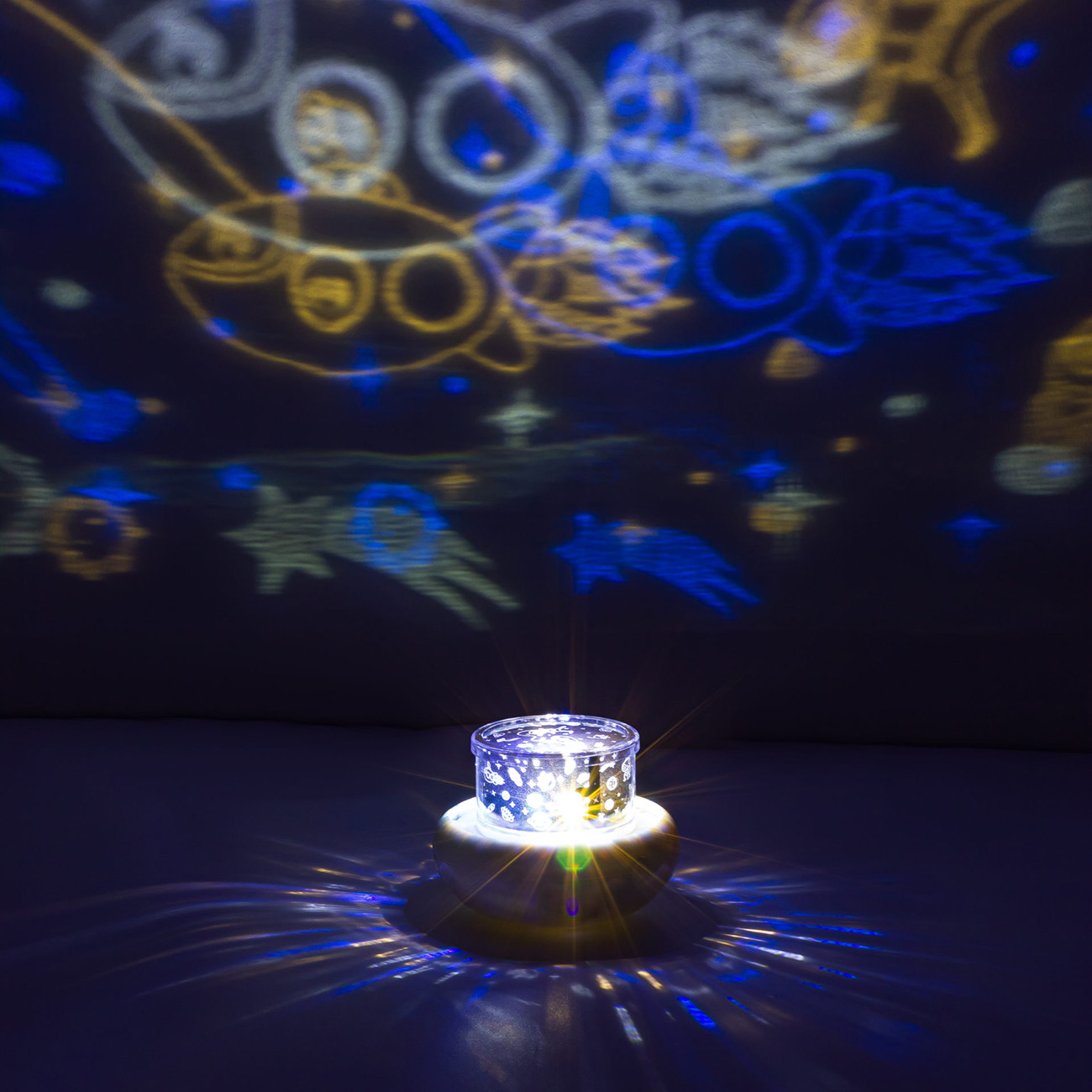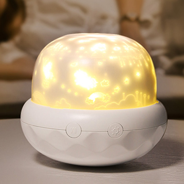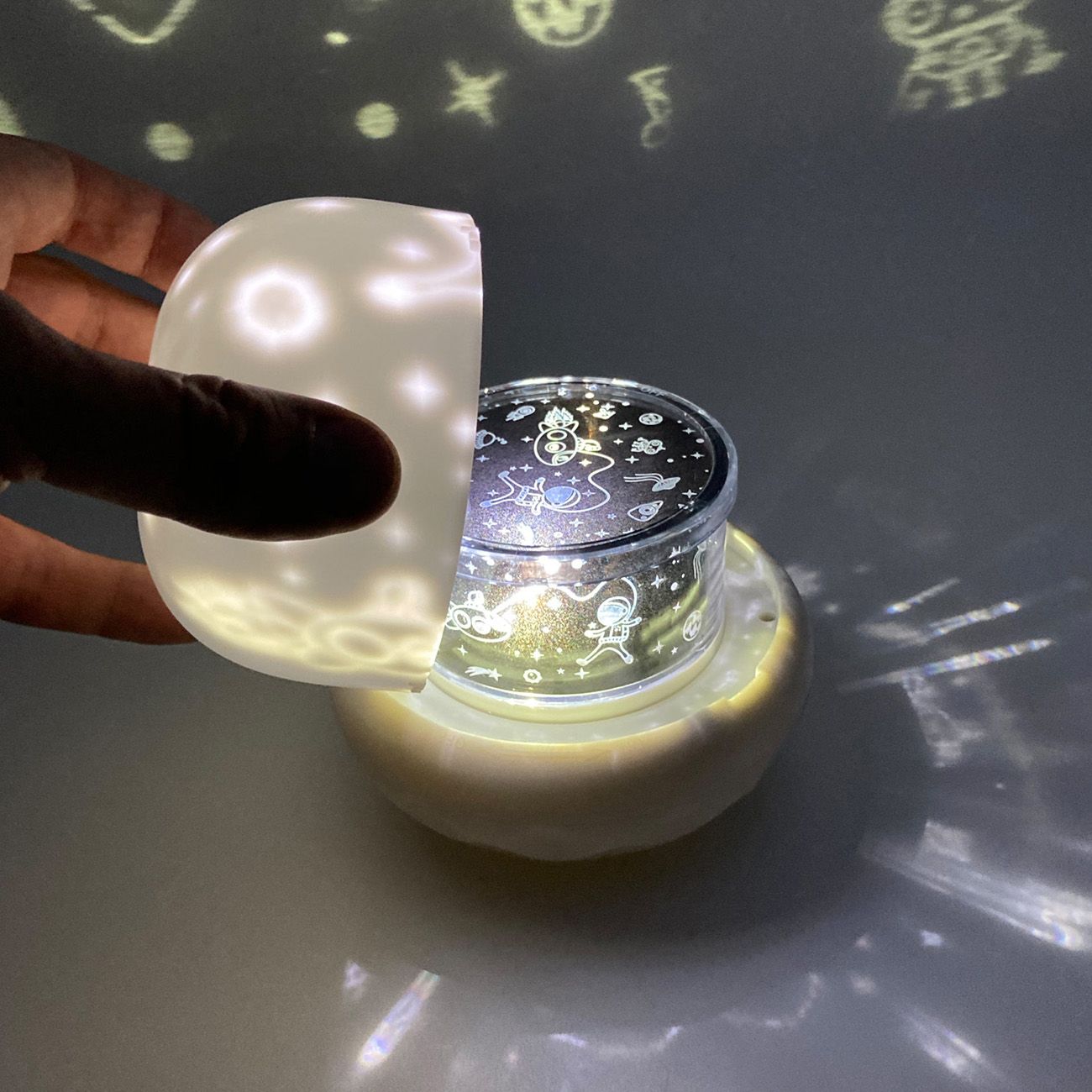 Обычный светильник, не чего такого прям сверхисключительного! Сделан довольно качественно, облоев пластика, неровных краев или не качественной сборки не увидел! Удобно, что есть встроенный аккумулятор, можно его подзарядить и включать без провода! Можно его использовать как просто ночник, так и как проектор на патолог со сменными картриджами (пленками), свет также меняется! Довольно компактный и удобный, не тяжелый!