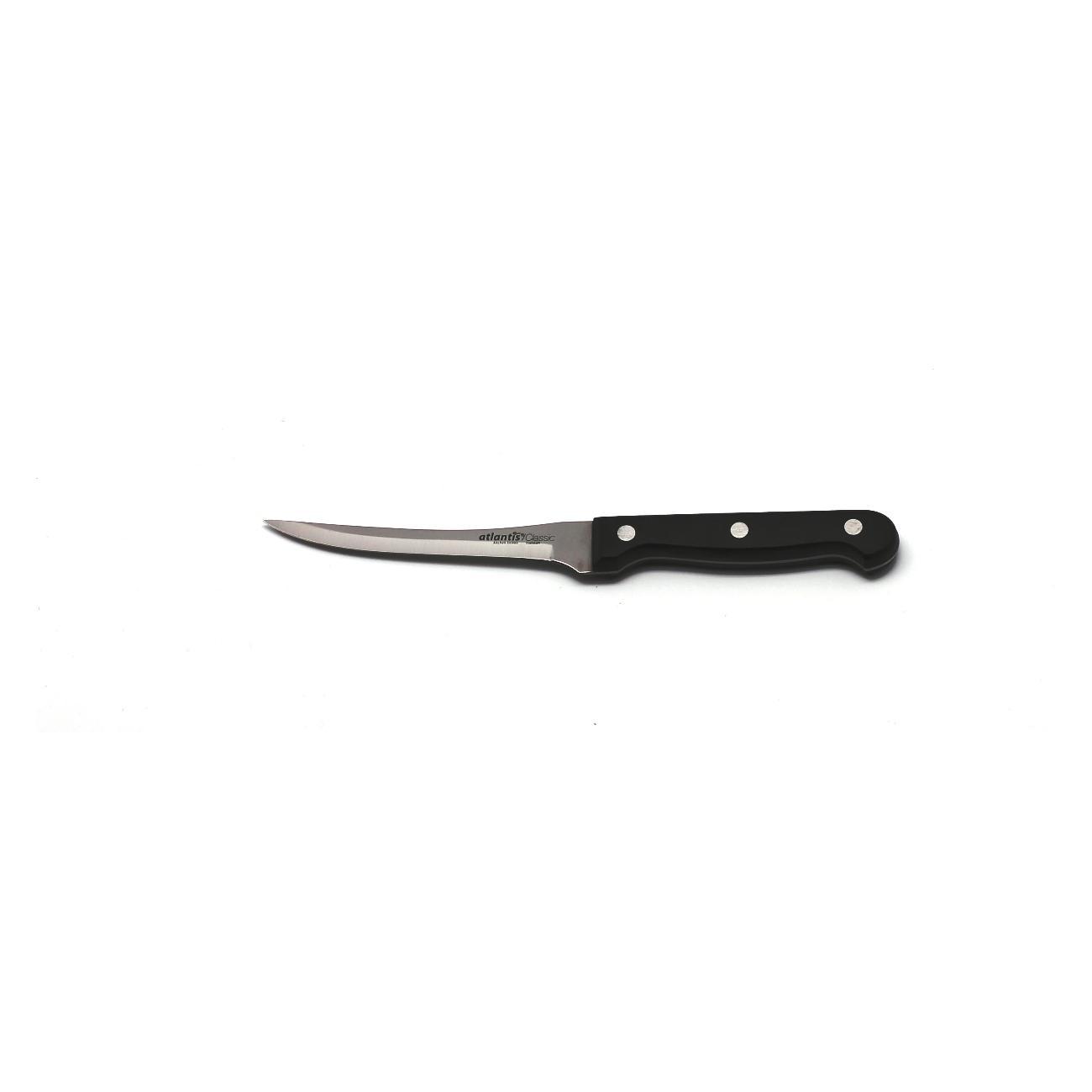 Нож Atlantis 10 см 24318-SK с черной рукояткой хорошо сбалансирован и удобен в процессе эксплуатации. Габариты модели — 21х1,7х2 см. Вес изделия — 60 г. Бакелитовая эргономичная ручка не скользит в руке.
