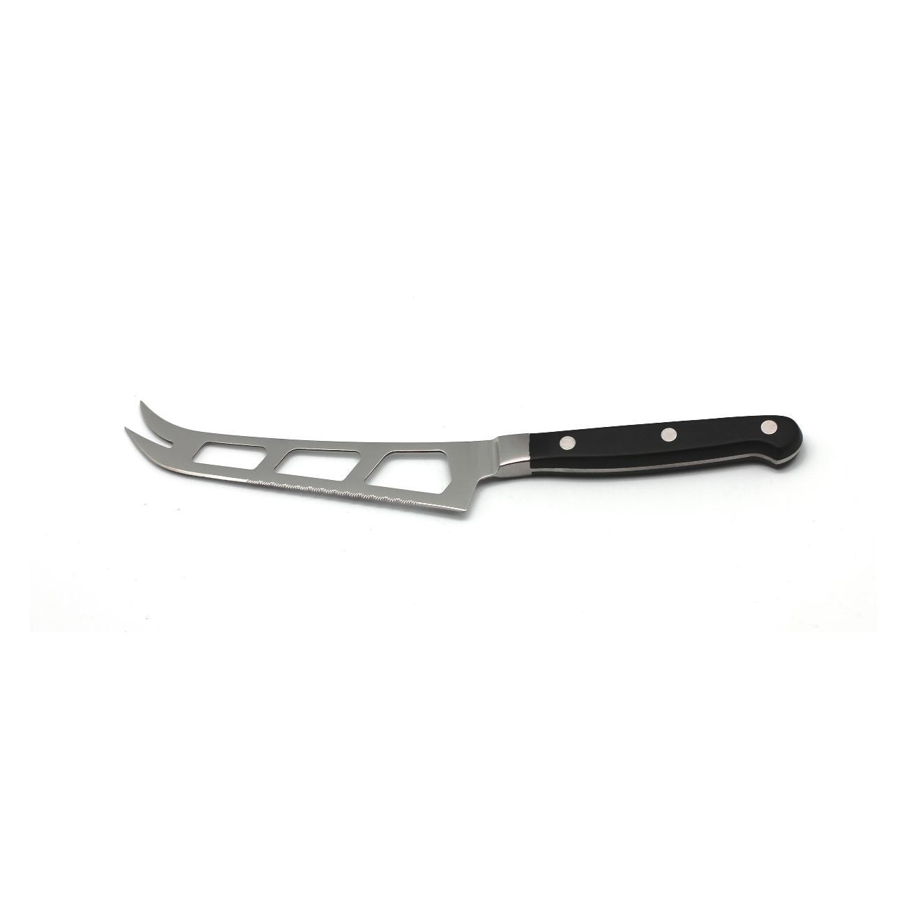 Нож Atlantis 14 см 24116-SK черного цвета подходит для резки сыра твердых и мягких сортов. Эргономичная бакелитовая ручка обеспечивает надежный хват, не скользит в руке. Лезвие с зубчатой кромкой оснащено вилкой на конце, позволяющей перекладывать кусочки сыра. Отверстия не допускают прилипания продукта.