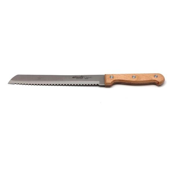 Нож Atlantis 20 см 24802-SK коричневого цвета предназначен для нарезания хлебобулочных изделий. Благодаря волнистой кромке лезвия и хорошей заточке модель легко разрезает батон, не сминая его. Общая длина — 32 см. Ширина — 2 см. Вес — 170 г. Эргономичная деревянная рукоятка не выскальзывает из ладони. Лезвие сделано из качественного металла с антикоррозийным покрытием. Нож не повреждает хрустящую корочку, не деформирует и не лишает пышности изделия.