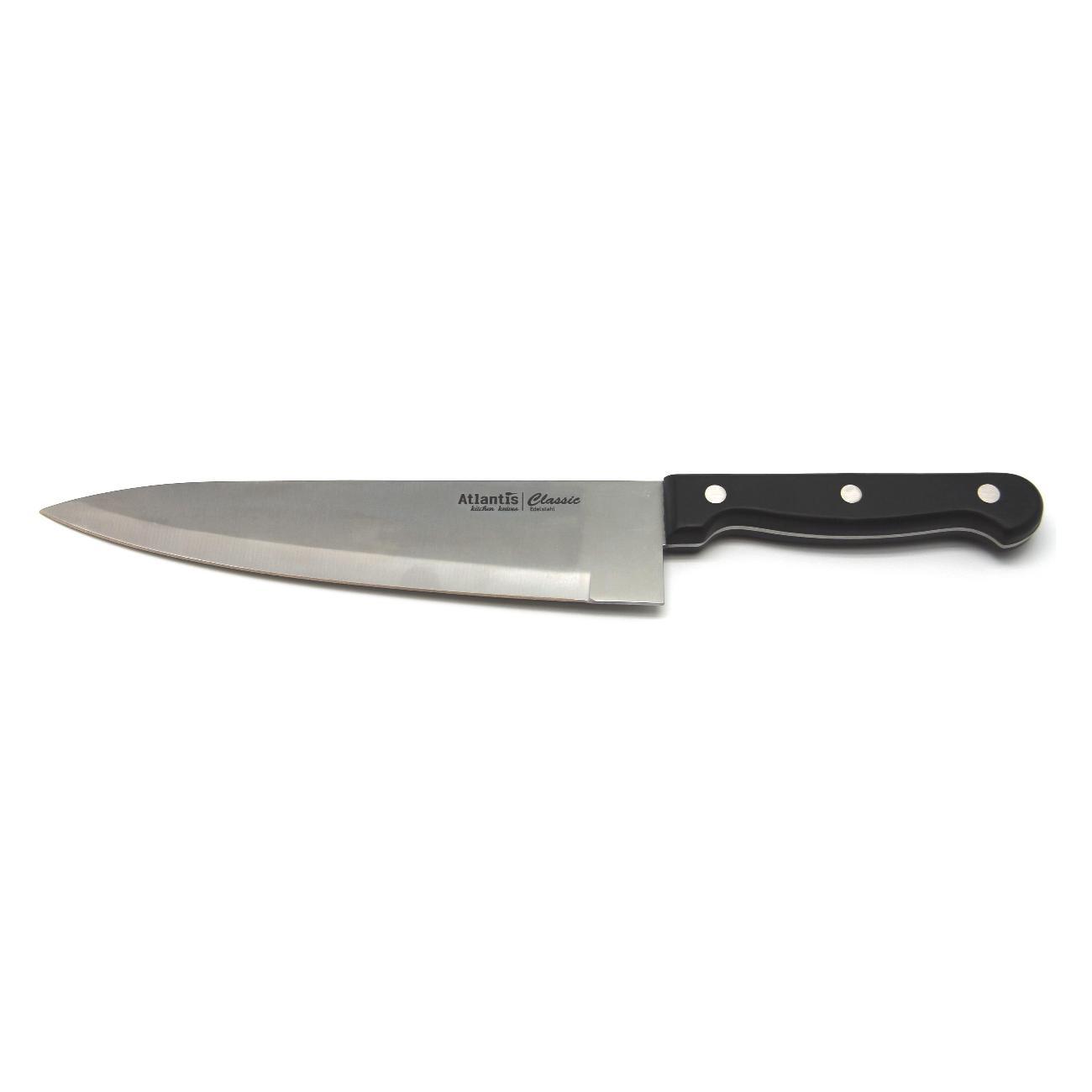 Нож Atlantis 20 см 24301-SK черного цвета оснащен удобной пластиковой рукояткой, которая надежно удерживается в ладони и не выскальзывает. Острое широкое лезвие сделано из качественного металла с антикоррозийным покрытием. Поварской нож легко очищается от загрязнений, долго сохраняет заточку.