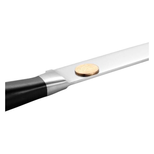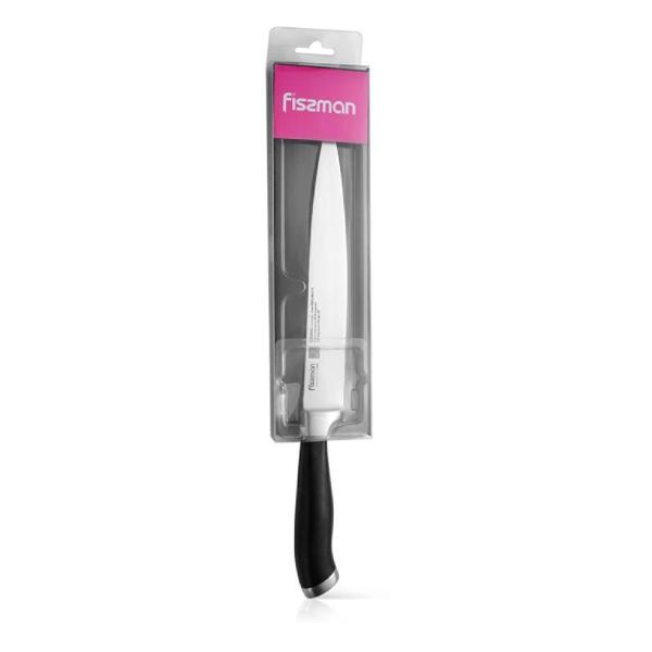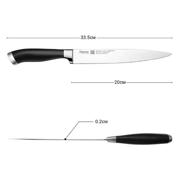 Нож Fissman Elegance 2468 изготовлен из нержавеющей стали и дополнен пластиковой ручкой черного цвета. Лезвие шириной 2 мм и длиной 20 см получило двухстороннюю заточку. Для упора во время приготовления пищи и предотвращения соскальзывания пальцев предусмотрена утолщенная пята. Модель рекомендуется мыть вручную.