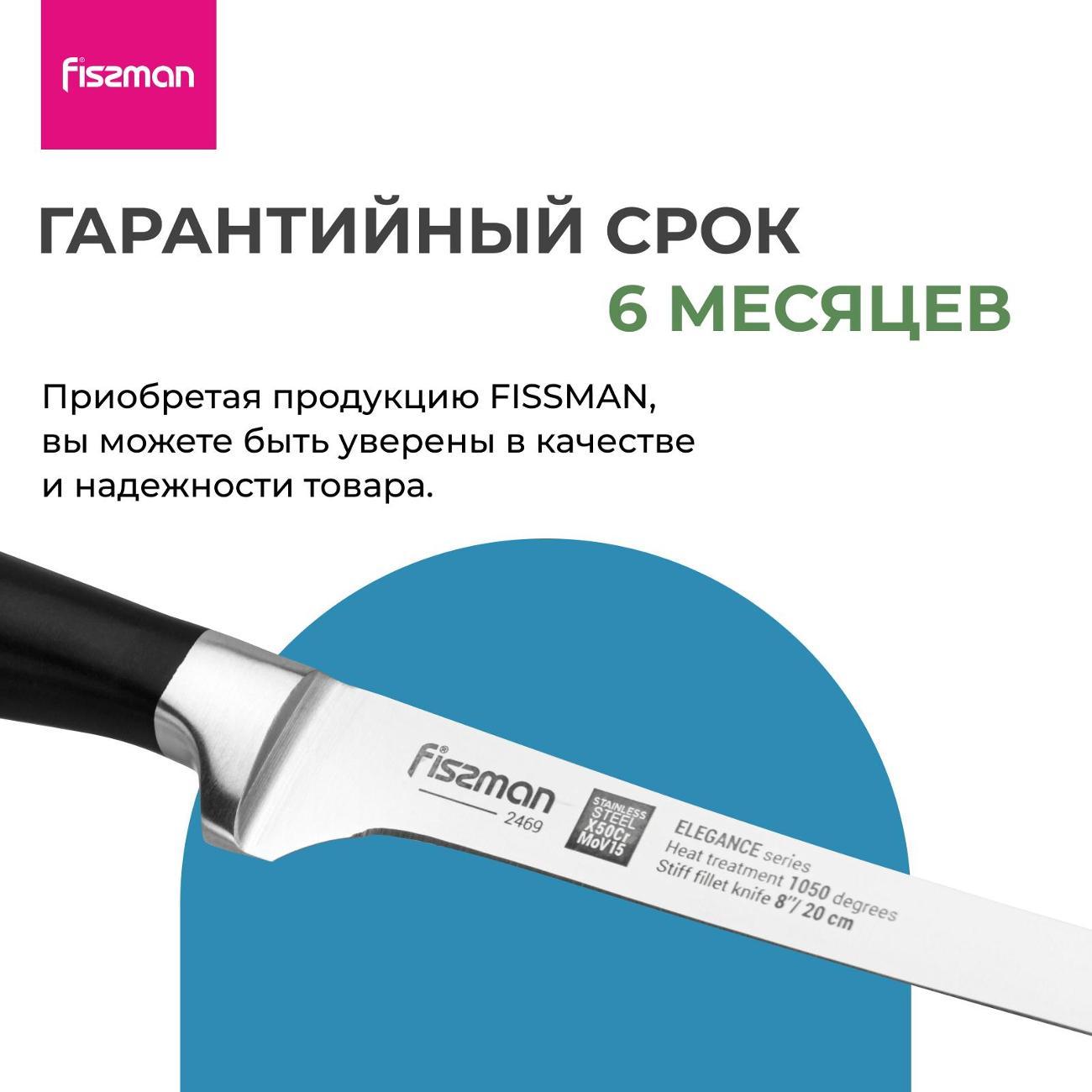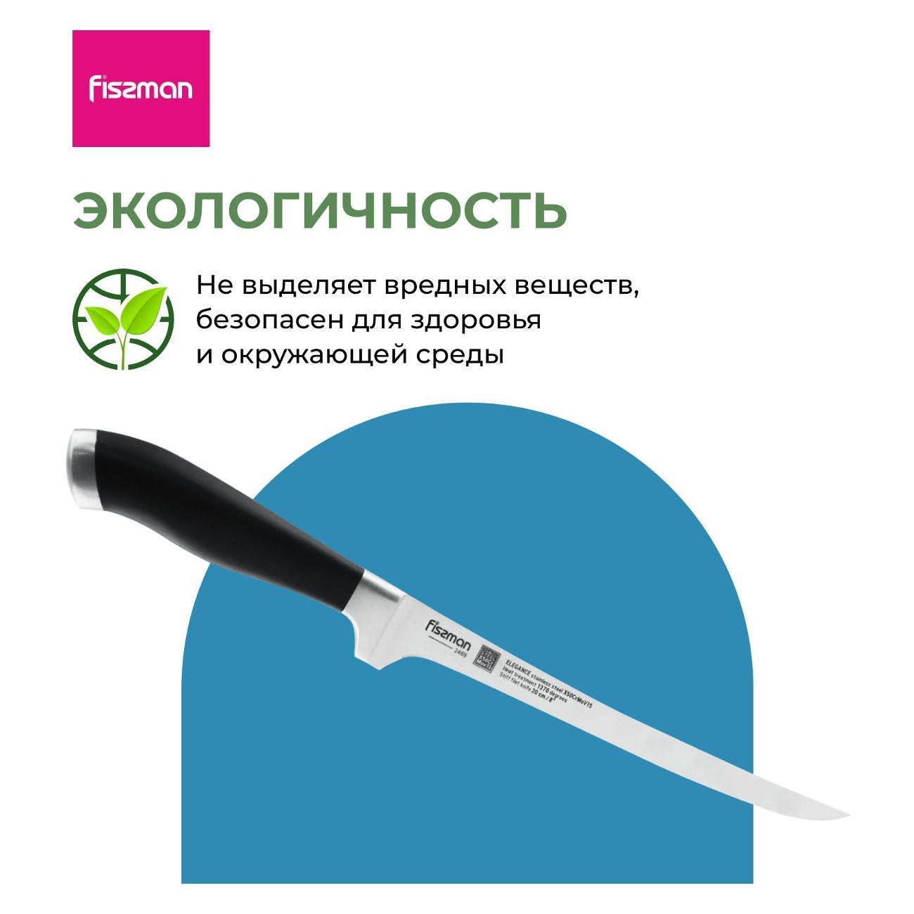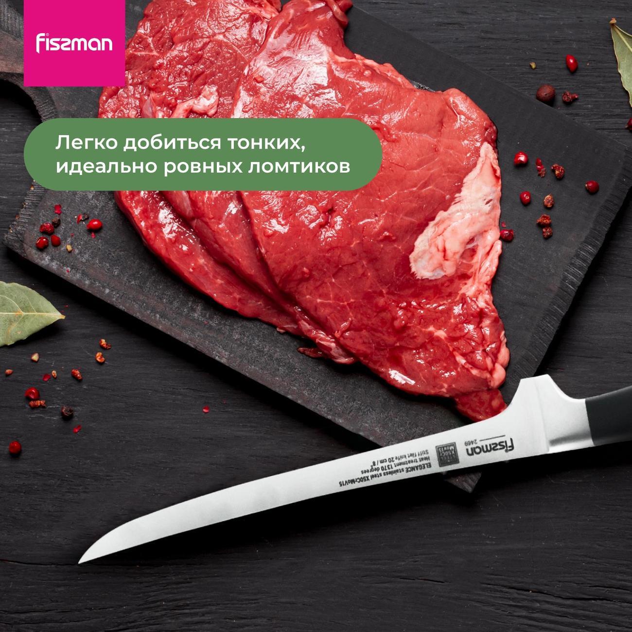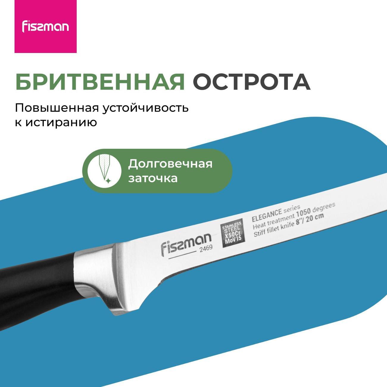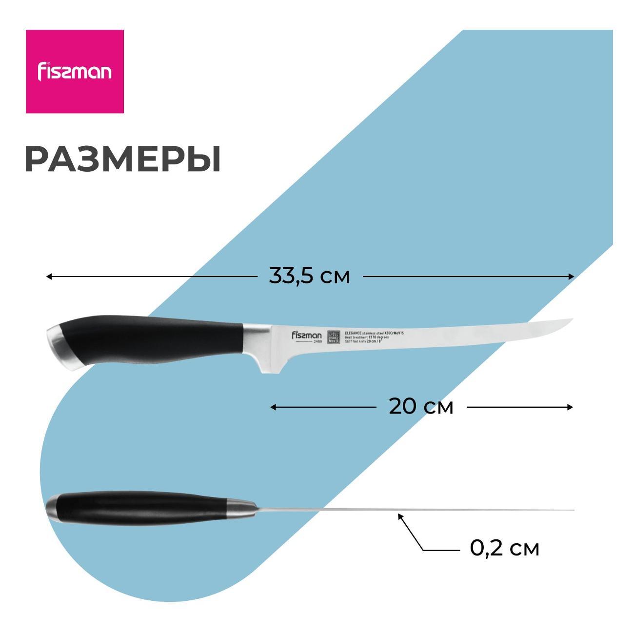 Нож Fissman Elegance 2469 оптимален для получения филе при обработке мяса, птицы и рыбы. Тонкое и острое лезвие длиной 20 см и толщиной 2 мм обеспечивает ровную нарезку. Изделие изготовлено из высококачественной нержавеющей стали, стойкой к механическим повреждениям, деформации и образованию коррозии, что гарантирует длительный эксплуатационный срок. Рукоятка из прочного пластика отличается эргономичной формой, благодаря чему достигается комфортный хват. Модель черно-серебристого цвета весит 0,212 кг. Габариты равны 34х2х1,5 см.