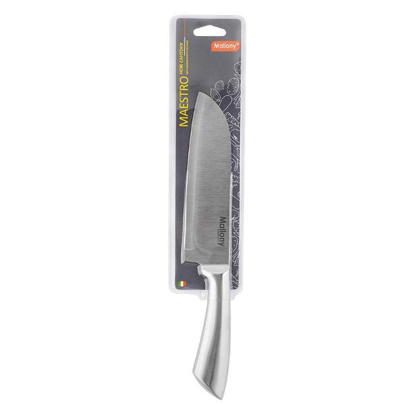 Нож Mallony MAL-01M «Сантоку» выполнен из прочной стали, устойчивой к образованию коррозии. Металлическое лезвие хорошо держит заточку. Длина рабочей части составляет 17 см, ширина равна 2 мм. Стальная ручка не скользит в руках. Нож подойдет для резки различных видов продуктов, разделывания мяса, птицы и рыбы. Модель подходит для мытья в посудомоечной машине. Тип корпуса — цельнометаллический. Вес составляет 0,168 кг.