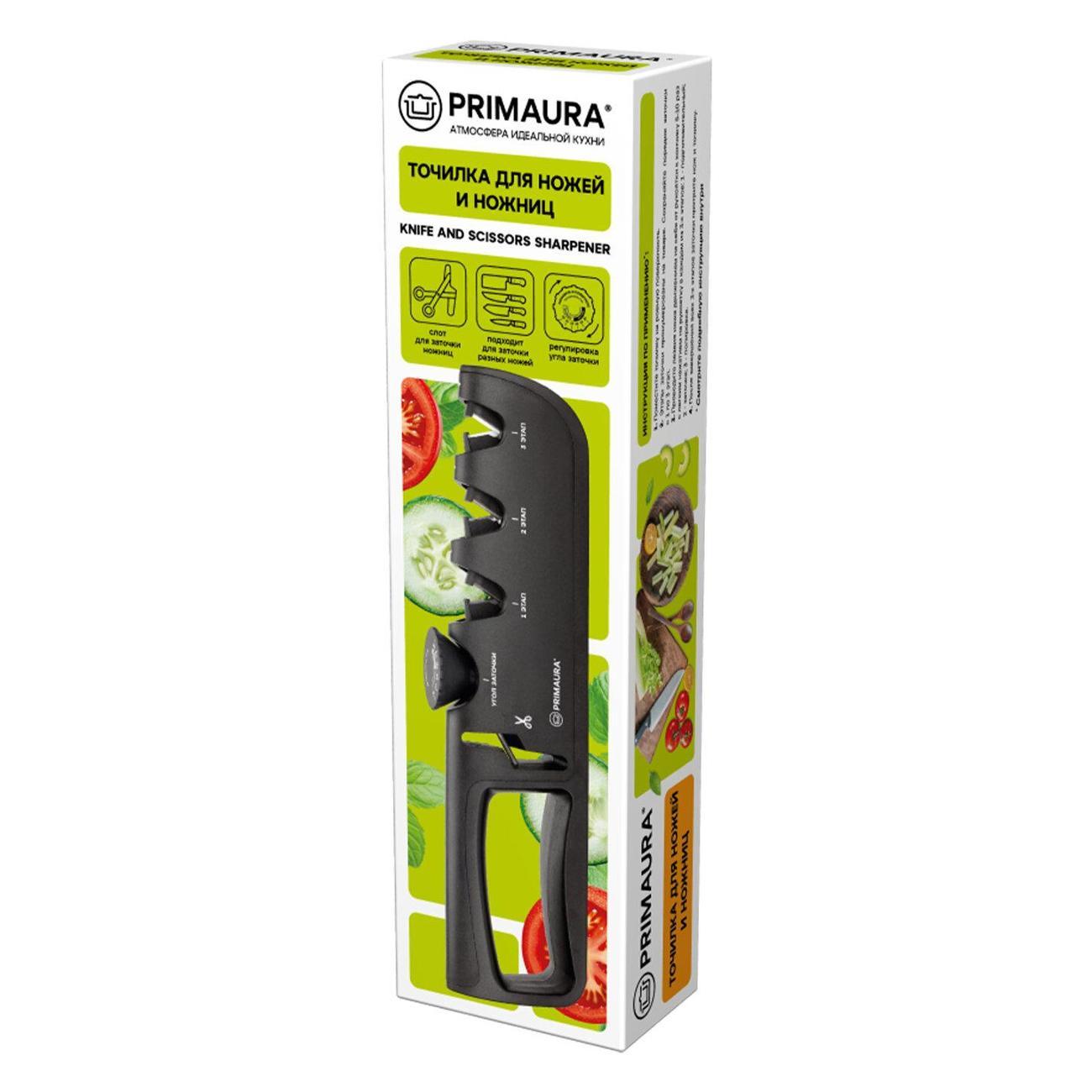 Точилка PRIMAURA предназначена для профессиональной заточки различных типов ножей и ножниц. Устройство обеспечивает полный цикл обработки лезвия от грубой заточки до финишной полировки. Главным преимуществом данной ножеточки является регулируемый угол (от 14° до 24°) заточки лезвия ножа, что позволяет достичь идеальной остроты лезвия без потери прочности ножа. Для вашего удобства на корпусе точилки присутствует таблица соответствия угла заточки к конкретному типу ножа.