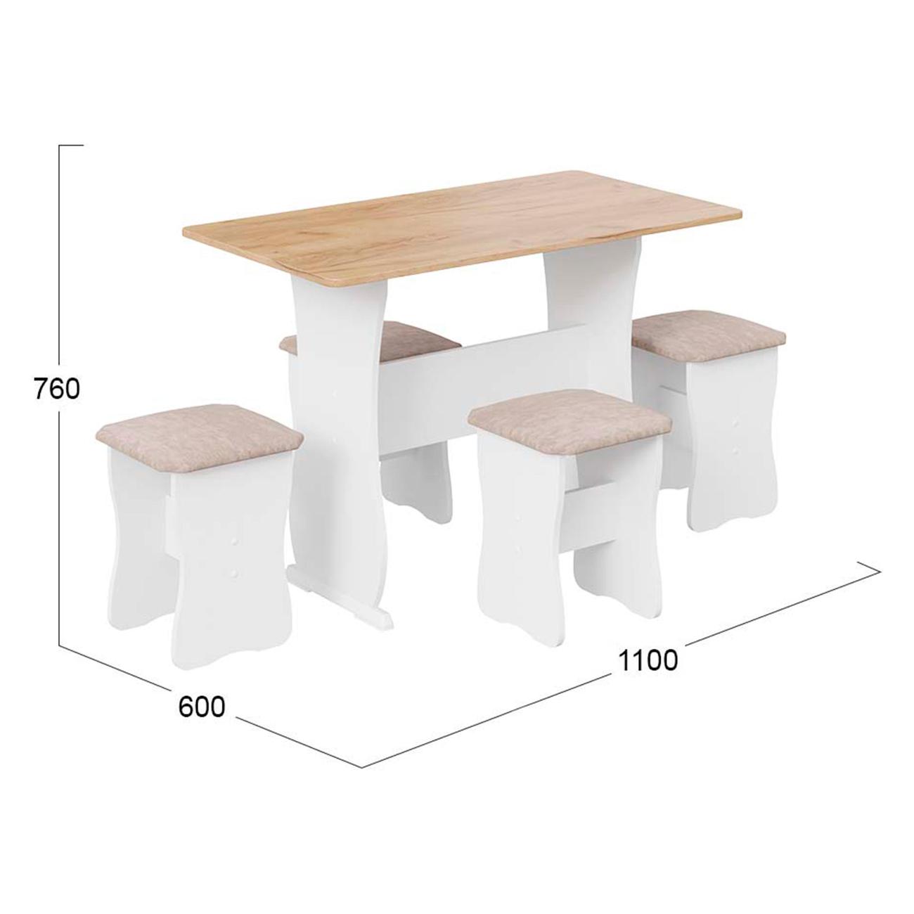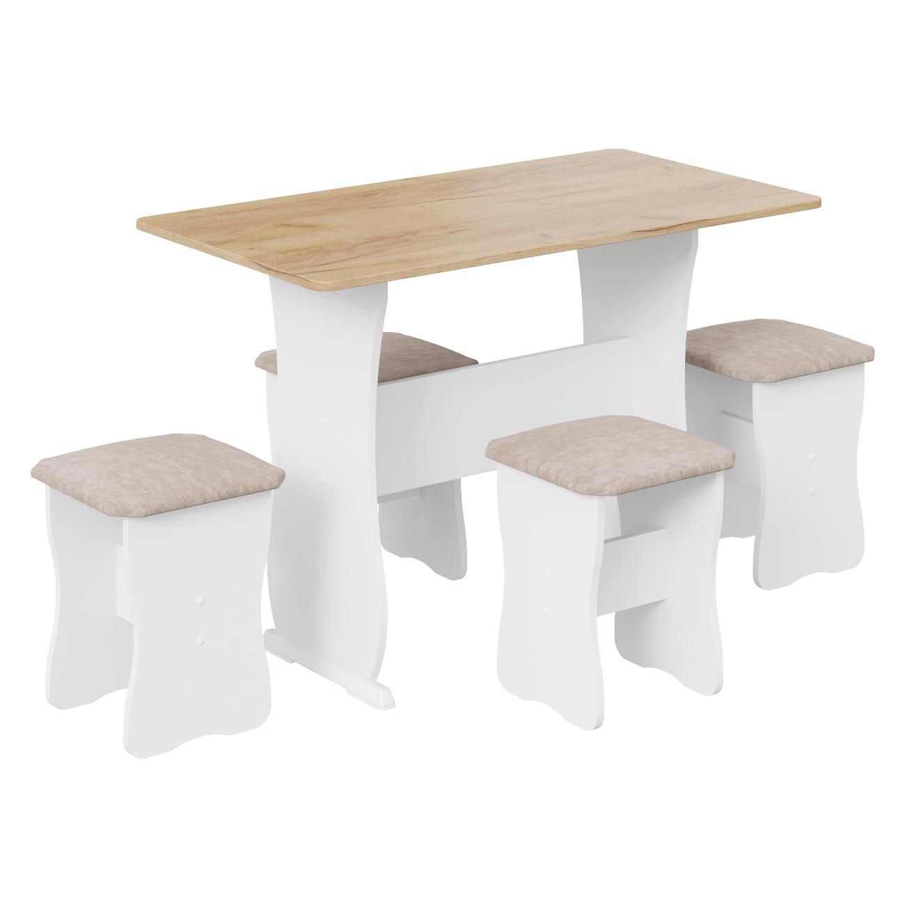 Обеденная группа тип 1 включает себя четыре табурета и стол. Классический минималистичный дизайн, сбалансированная конструкция, доступная цена и разнообразие расцветок набора позволяют приобрести подходящую модель для помещения, оформленного в любом стиле. Исполнение кухонного столика заключается в простых формах, является устойчивым и компактным, что дает возможность сэкономить место на кухне и обеспечивает дополнительное пространство.  Стулья оснащены мягкой обивкой из пенополиуретана, что создает комфорт и удобство при сидении. Каркас изготовлен из высококачественного материала ЛДСП - 16мм, столешница - 22 мм. За столом могут разместиться до 4 человек. Комплект мебели представляет собой функциональной и мобильной, а также качественной продукцией и экологически чистым изделием. Набор выглядит гармонично, создавая благоприятную и располагающую атмосферу. Поставляется в разобранном виде. Фурнитура для сборки и инструкция в комплекте.