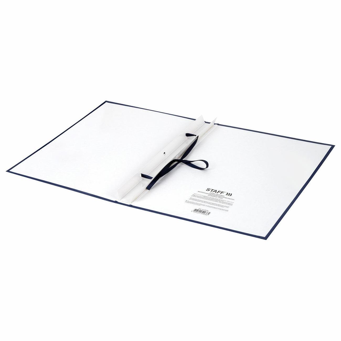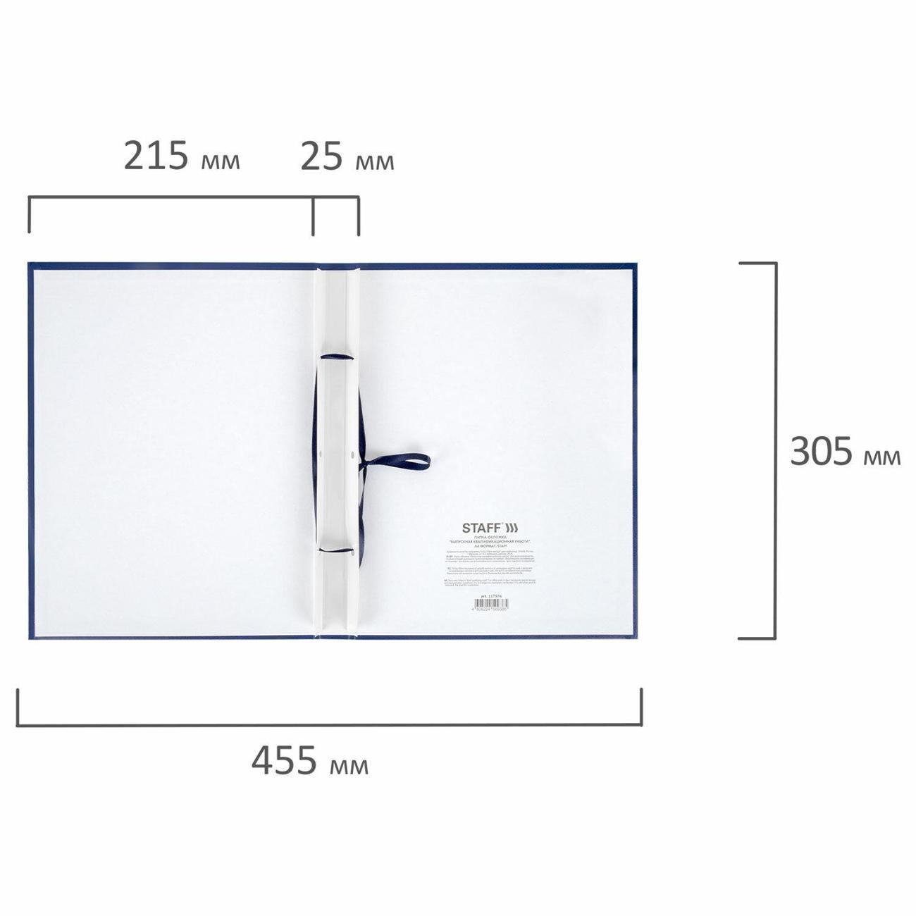 Корешок папки вмещает до 150 листов. Для удобства сшивания предусмотрены 3 отверстия и шнурок. Жёсткая обложка защищает содержимое и придаёт работе аккуратный вид. Папка формата А4 (215х305 мм) выполнена в глубоком синем цвете и украшена тиснением фольгой с надписью "Дипломный проект" на лицевой стороне.
