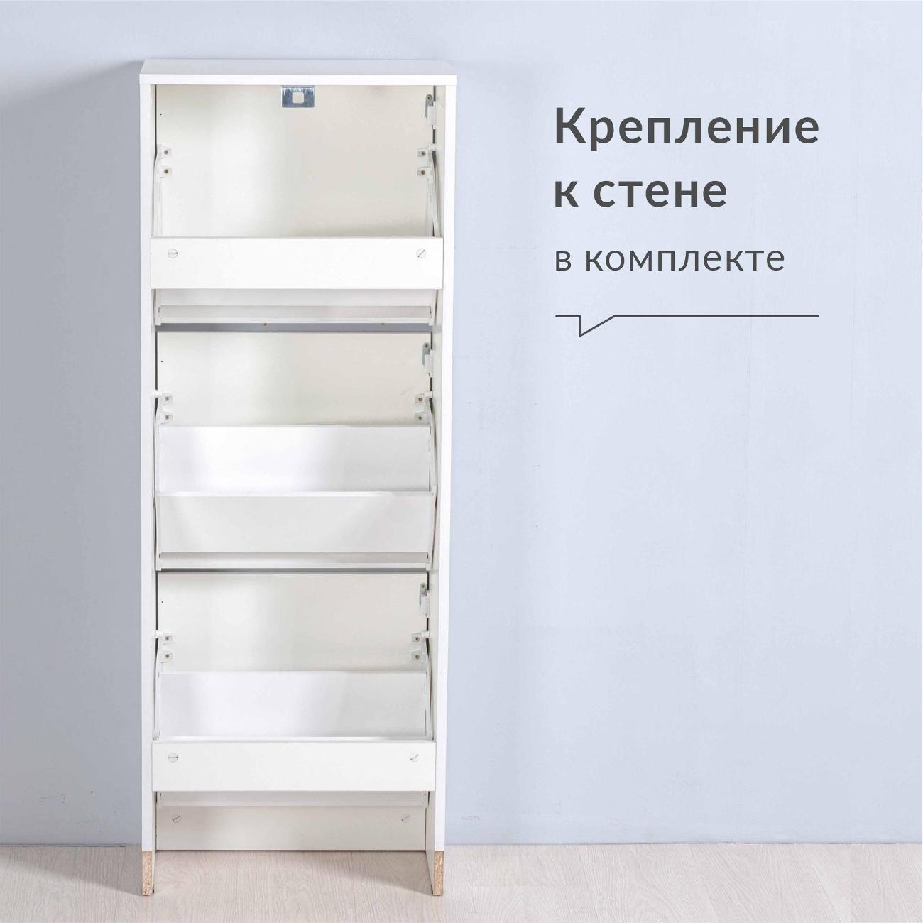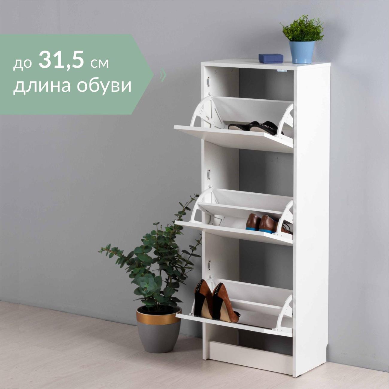 Три регулируемые полки позволяют компактно разместить до 12 пар обуви. Закрытая конструкция с дверцами защищает обувь от пыли. Верхняя крышка служит полкой для аксессуаров. Узкая конструкция экономит место в прихожей. Прочная фурнитура и магнитные защёлки на дверцах обеспечивают надёжность. Регулируемые полки можно настроить под разную обувь.