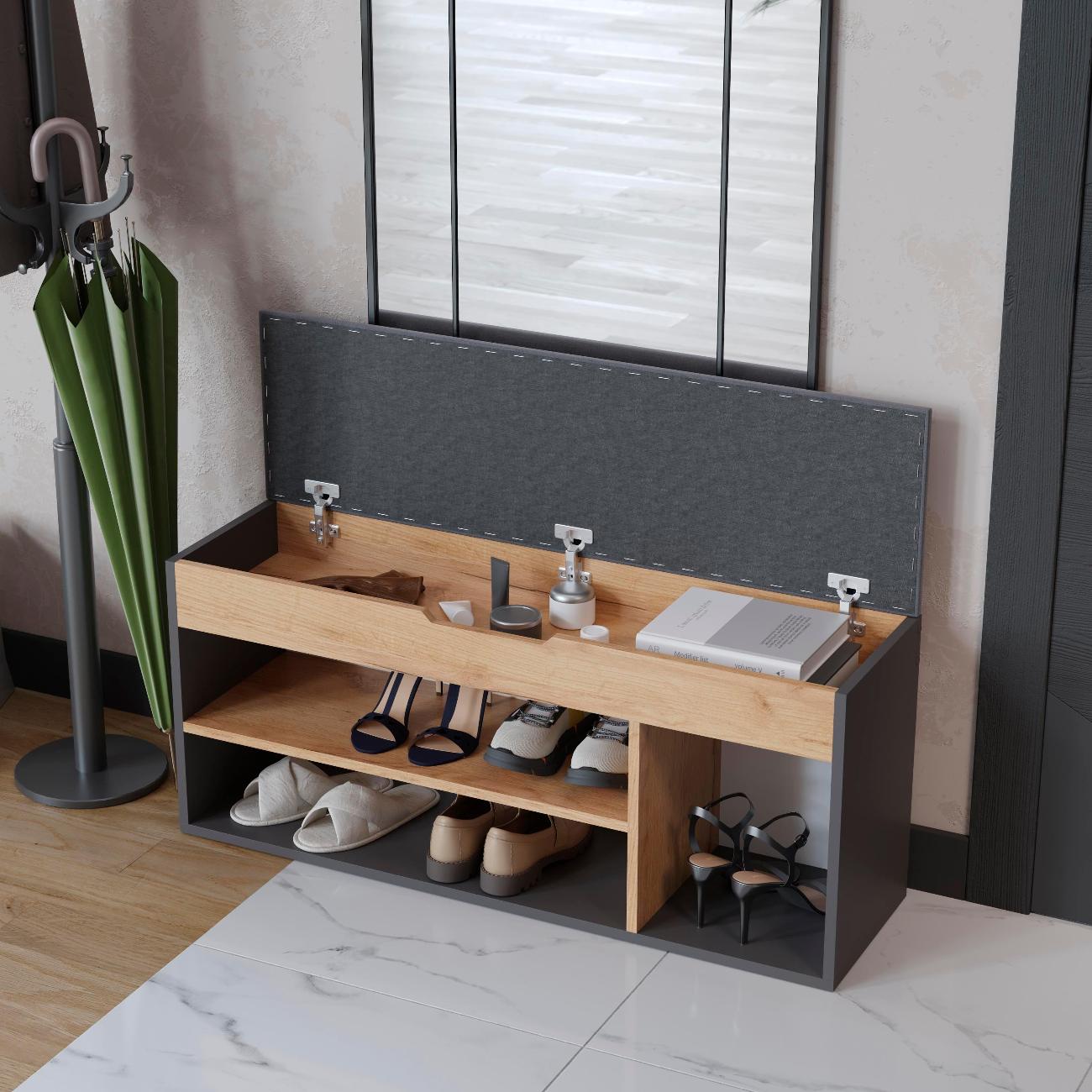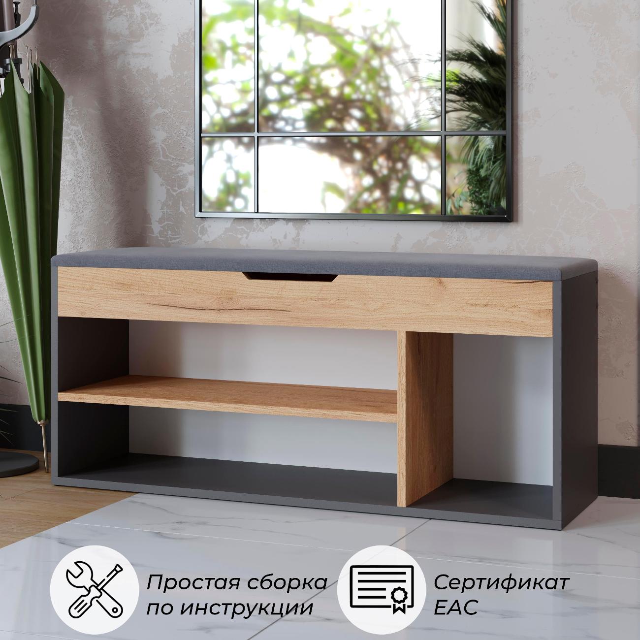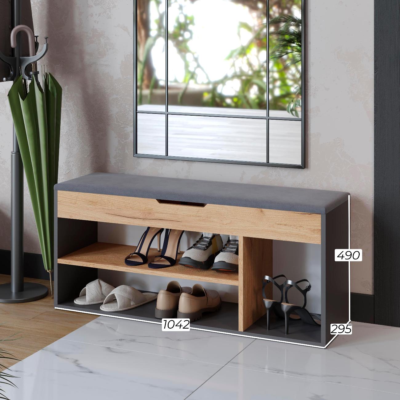 Тумба для обуви тип 12 - это компактная и функциональная мебель, которая идеально подходит для прихожей. Обувница - это отличное решение для хранения обуви в гостинице или коридоре. Этажерка для обуви имеет открытые полки, на которых можно разместить всю вашу обувь, а также сиденье на обувнице обеспечивает дополнительный комфорт при надевании и снятии обуви. Открытая конструкция позволяет воздуху свободно циркулировать, что предотвращает появление неприятного запаха и плесени. Сиденье выполнено из ткани велюра. Обувница с открытыми полками и сиденьем - это не только функциональный элемент интерьера, но и стильный аксессуар, который добавит уюта и комфорта в ваш дом. Обувница с ящиком позволяет хранить ключи, документы или другие предметы, которые всегда должны быть под рукой.Тумба для обуви с сиденьем удобна для прихожей и может быть использована как место для сидения. Деревянная тумба для обуви имеет быстрый и простой процесс сборки. Удобная обувница - это идеальное решение для тех, кто ценит комфорт и удобство. Обувница с открытыми полками выполнена из качественных материалов, которые обеспечивают ее долговечность и надежность. Этажерка с сидением легко впишется в любой интерьер благодаря своей универсальности и стильному дизайну. Габариты: высота - 49 см ,глубина - 30 см,ширина 104 см. Поставляется в разобранном виде. Шкаф для обуви, который можно поставить в любой уголок комнаты или коридора - это отличный подарок в праздничной упаковке на Новый год или день рождения.