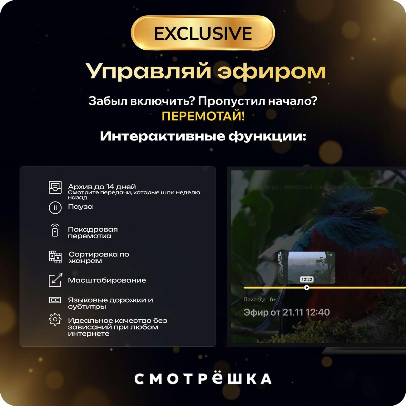 Подписка на онлайн-кинотеатр «Смотрёшка Exclusive» 12 месяцев: кино, сериалы и ТВ‑каналы в одном приложении