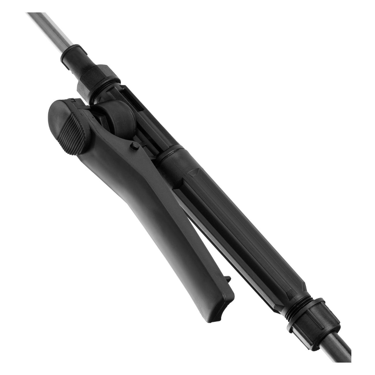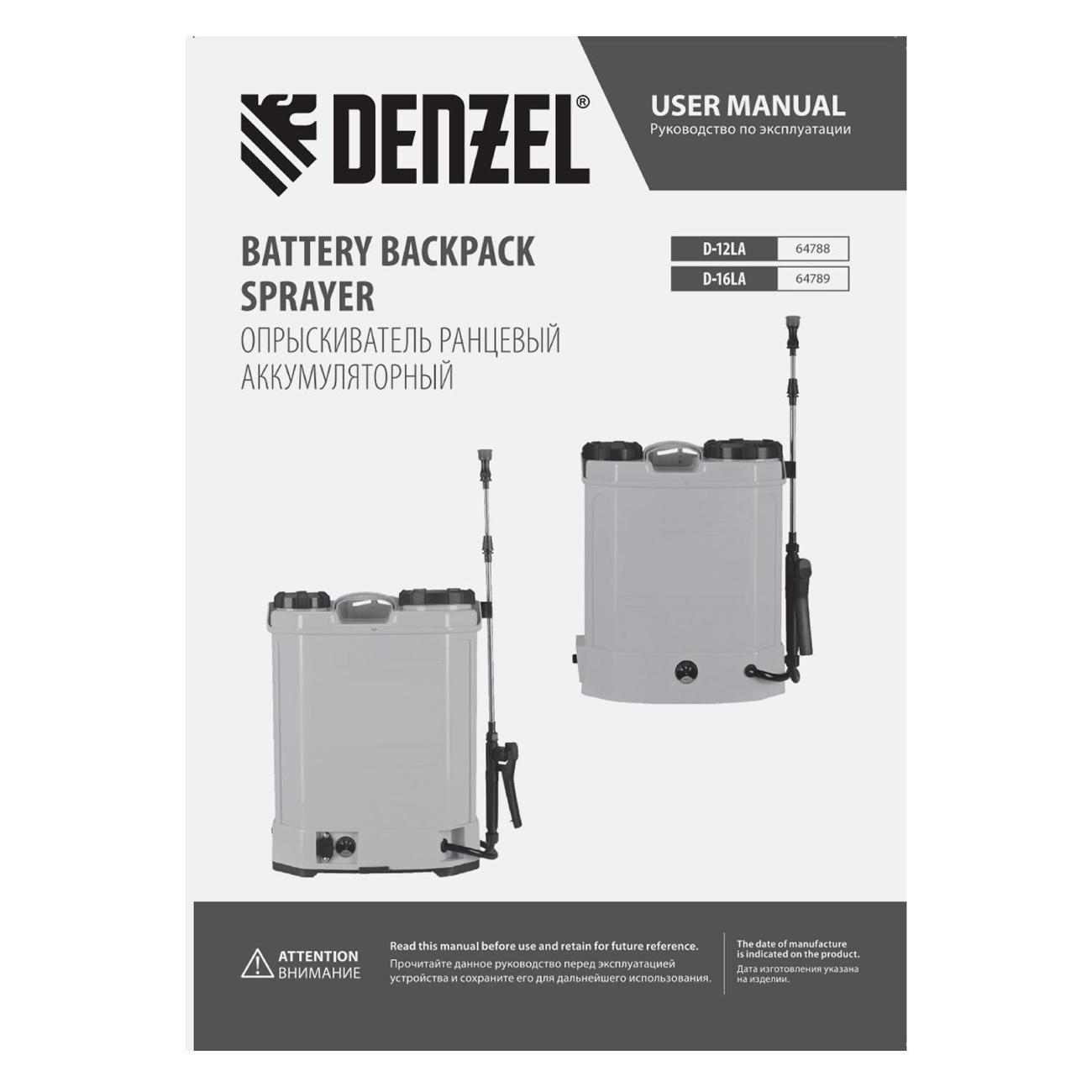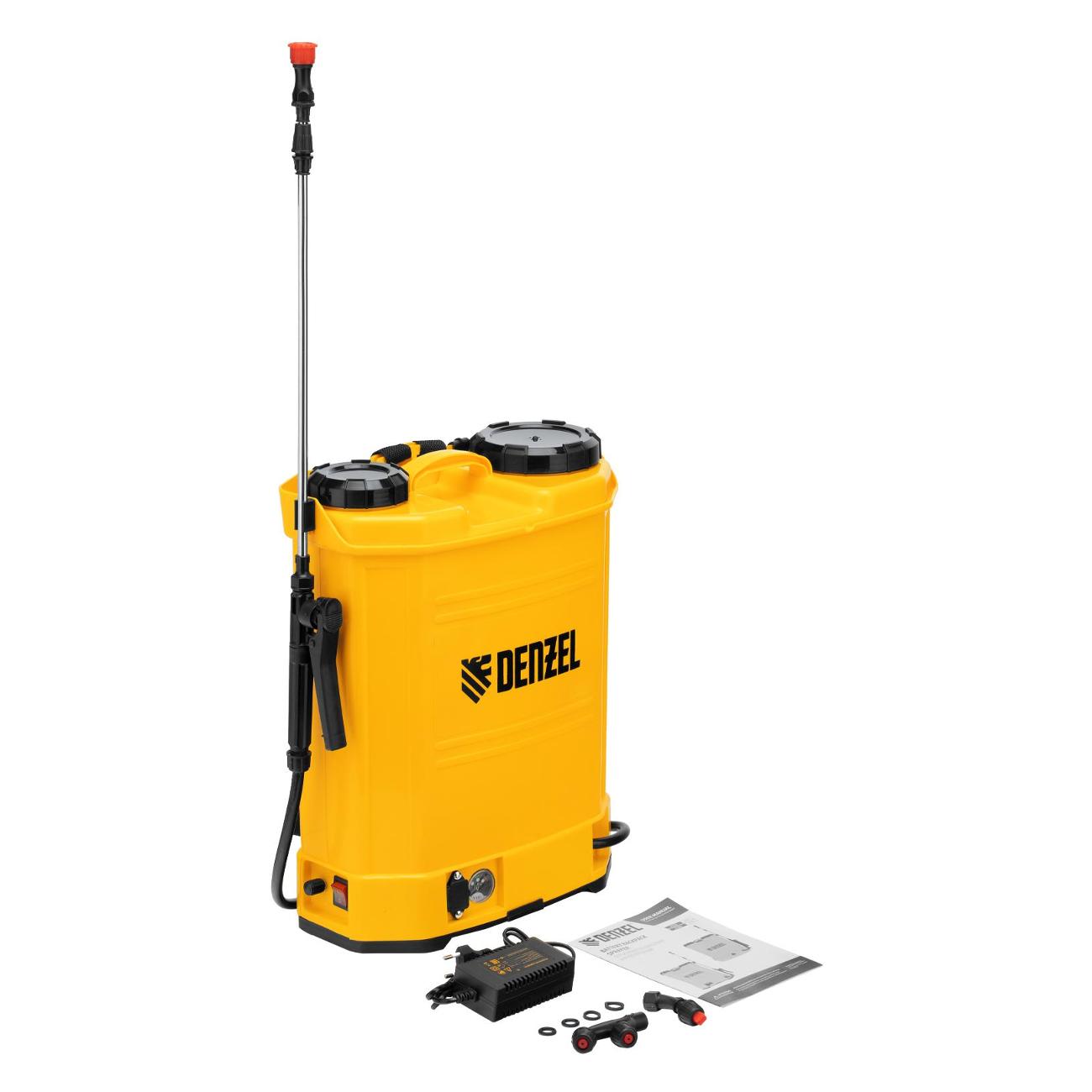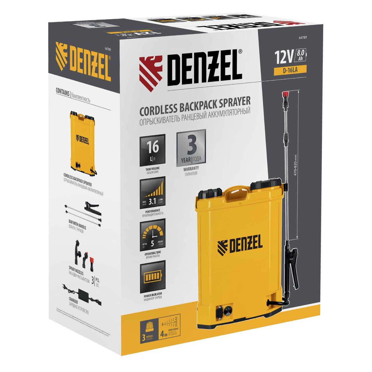 Опрыскиватель Denzel D-16LA применяется для распространения воды или инсектицидов, обработки помещений, чистки окон или фасадов домов. Конструкция устройства включает в себя бак объемом 16 л, шланг длиной 1,2 м и телескопический удлинитель, благодаря которому облегчается доступ к труднодоступным местам. На баке для раствора расположен фильтр, предотвращающий попадание загрязнений. Радиус распыления достигает показателя 15 м с возможностью регулировки. Корпус дополнен ремнем для переноски. За электропитание отвечает встроенный аккумулятор. Габаритные размеры — 48,5х20,5х38 см, вес — 6 кг.