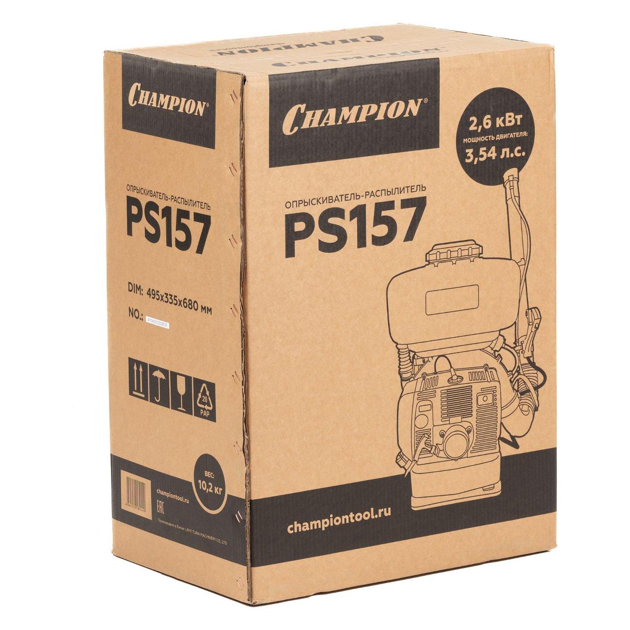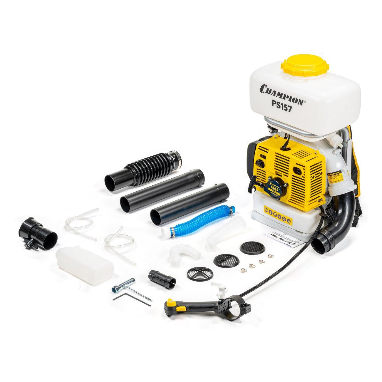 Опрыскиватель-распылитель Champion PS157 оснащен двигателем мощностью 2.6 кВт и предназначен для обработки садовых насаждений, защиты растений от вредителей и распыления удобрений.