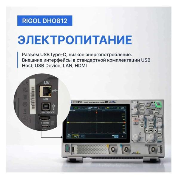 Цифровой осциллограф RIGOL DHO812 с двумя каналами – это универсальное устройство, объединяющее функции нескольких приборов. Оснащен ярким цветным сенсорным дисплеем, который обеспечивает удобство анализа сигналов. Панель управления выполнена в эргономичном дизайне с функциональными кнопками и регуляторами, упрощающими настройку параметров.