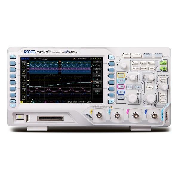 Цифровой осциллограф RIGOL DS1074Z Plus – это современное устройство, идеально подходящее для работы с различными типами сигналов. Компактный прибор выполнен в стильном корпусе светло-серого цвета с контрастными черными и цветными элементами интерфейса, обеспечивая эргономичное управление.