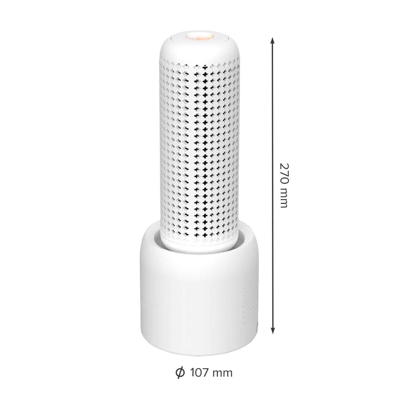 Габариты — 12х12х27 см. Вес — 1 кг. Длина сетевого кабеля с вилкой составляет 1 м. Зарядная станция в комплекте.