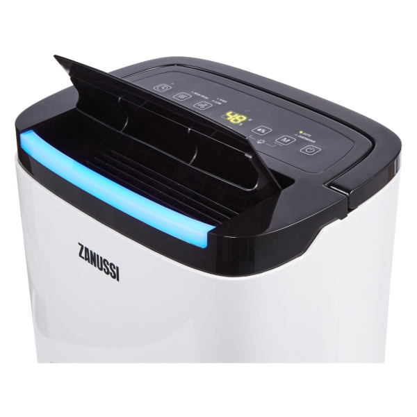 Сенсорная панель управления состоит клавиш выбора режимов («Непрерывное осушение», «Сушка одежды», «Авто»), уровня влажности, скорости вентилятора. Таймер позволяет запрограммировать время работы аппарата (от 1 до 24 часов) с последующим автоматическим отключением. Модель поддерживает режим самоочищения, который рекомендуется запускать перед долгим простоем в работе и для профилактики появления плесени. Блокировка управляющей панели позволяет избежать случайного изменения настроек.