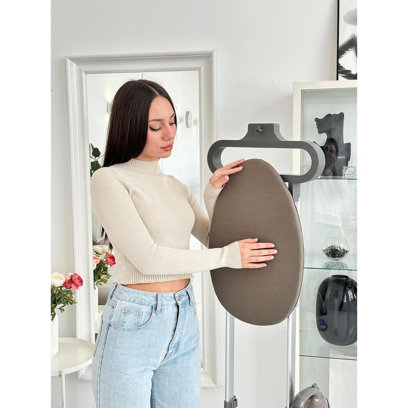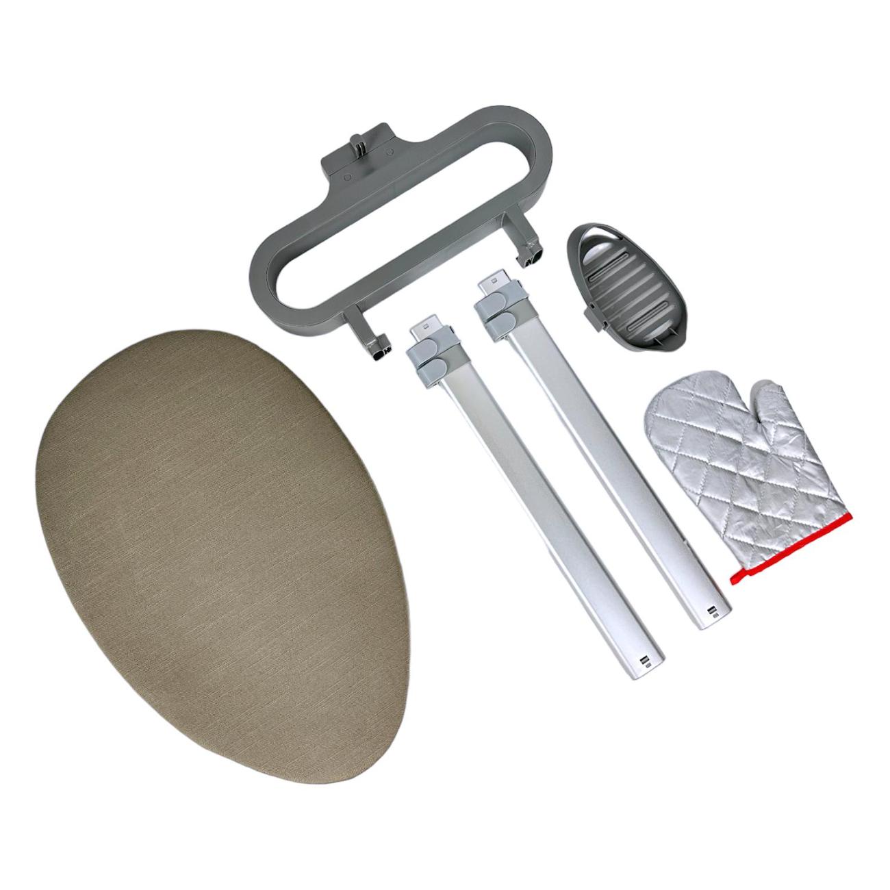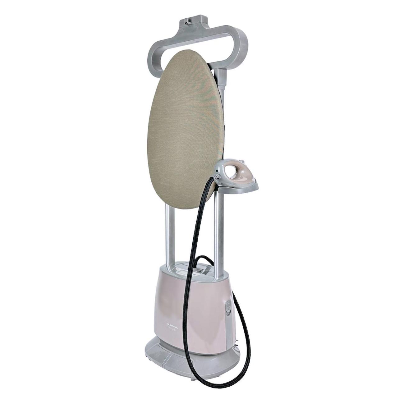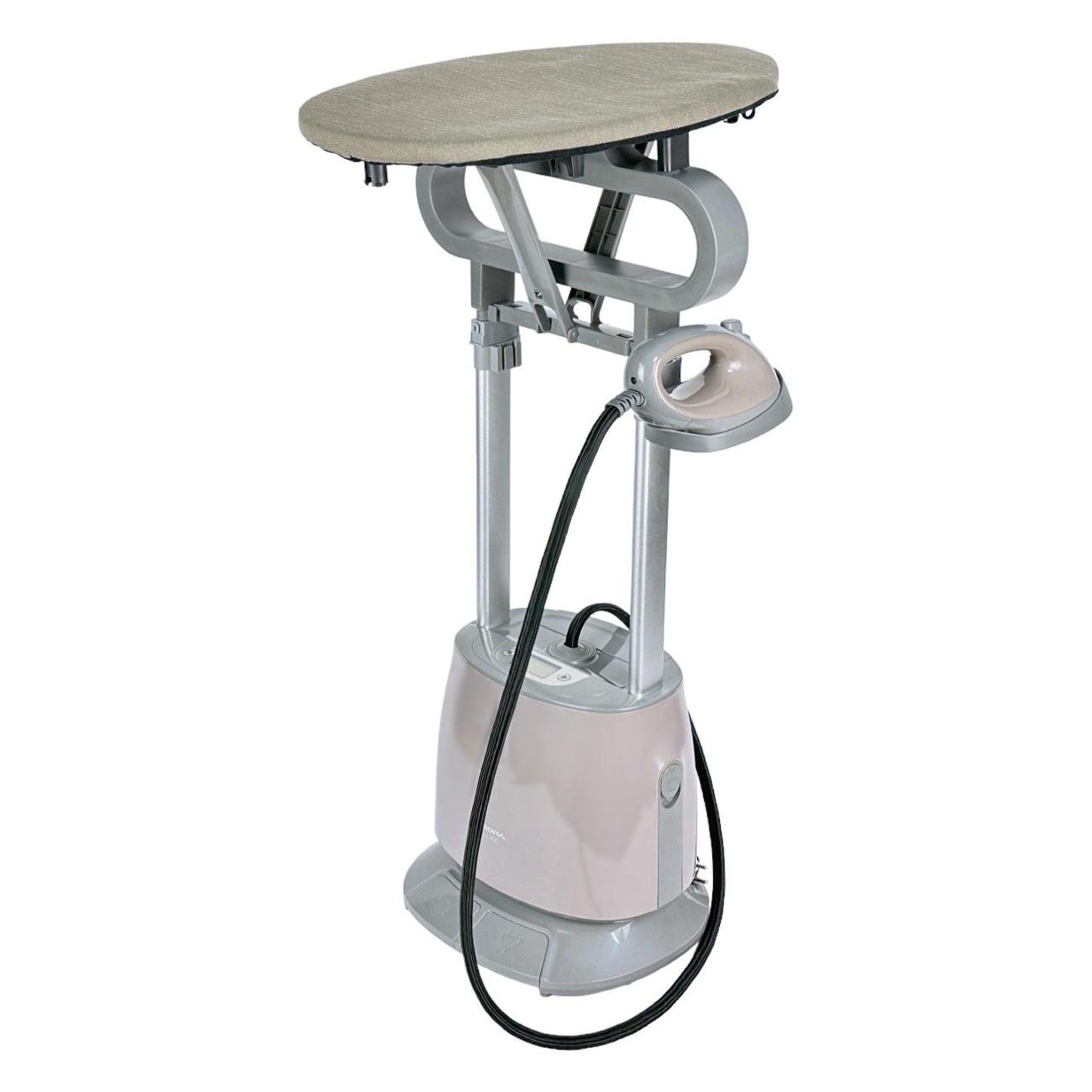 В нижней части корпуса находятся колесики, которые облегчают транспортировку отпаривателя. Стойка телескопическая, варьируется по высоте. Сетевой кабель сматывается автоматически. Отпариватель потребляет 2300 Вт электроэнергии. В комплект входят защитная рукавица, вертикальная гладильная доска, которая при необходимости может складываться, крючок для подвешивания одежды, чехол для отпаривания, подставка для утюга.