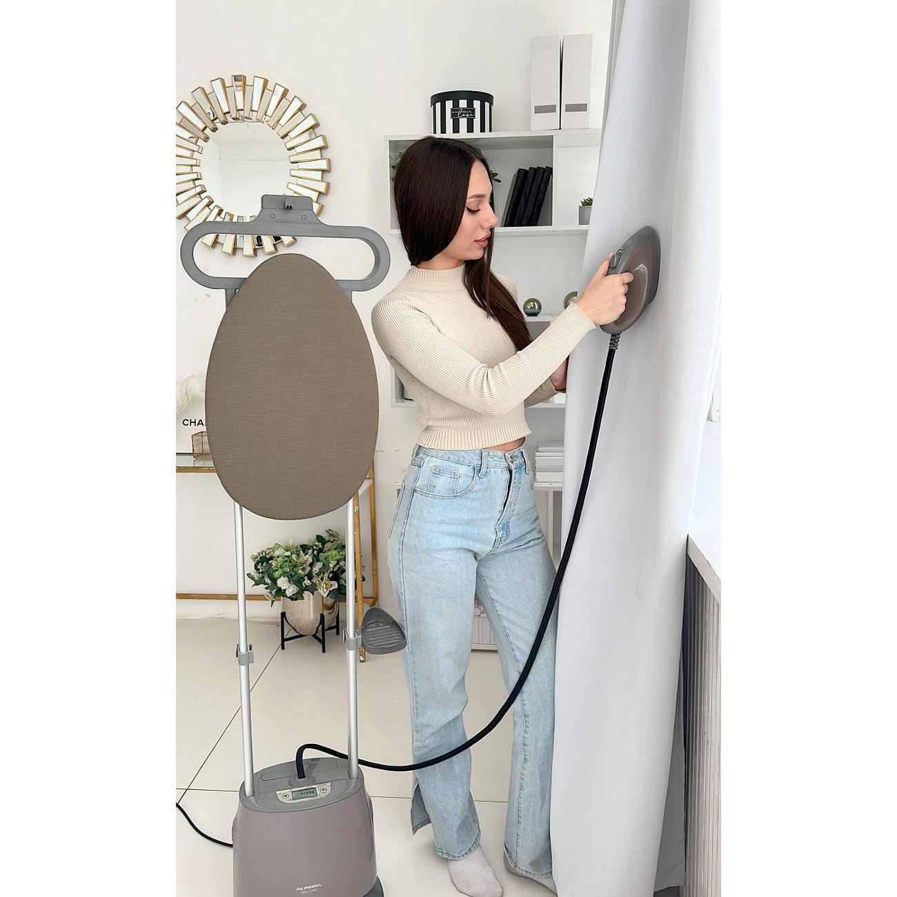 Самотечный отпариватель Aurora Deluxe в сером корпусе оснащен съемным резервуаром для воды объемом 1,5 л. Рабочее давление составляет 1,5 Бар. Отпариватель предназначен для напольного размещения. Имеет пять режимов подачи пара. Отпариватель подает пар мощностью 80 г/мин. Модель способна работать непрерывно в течение 45 минут.