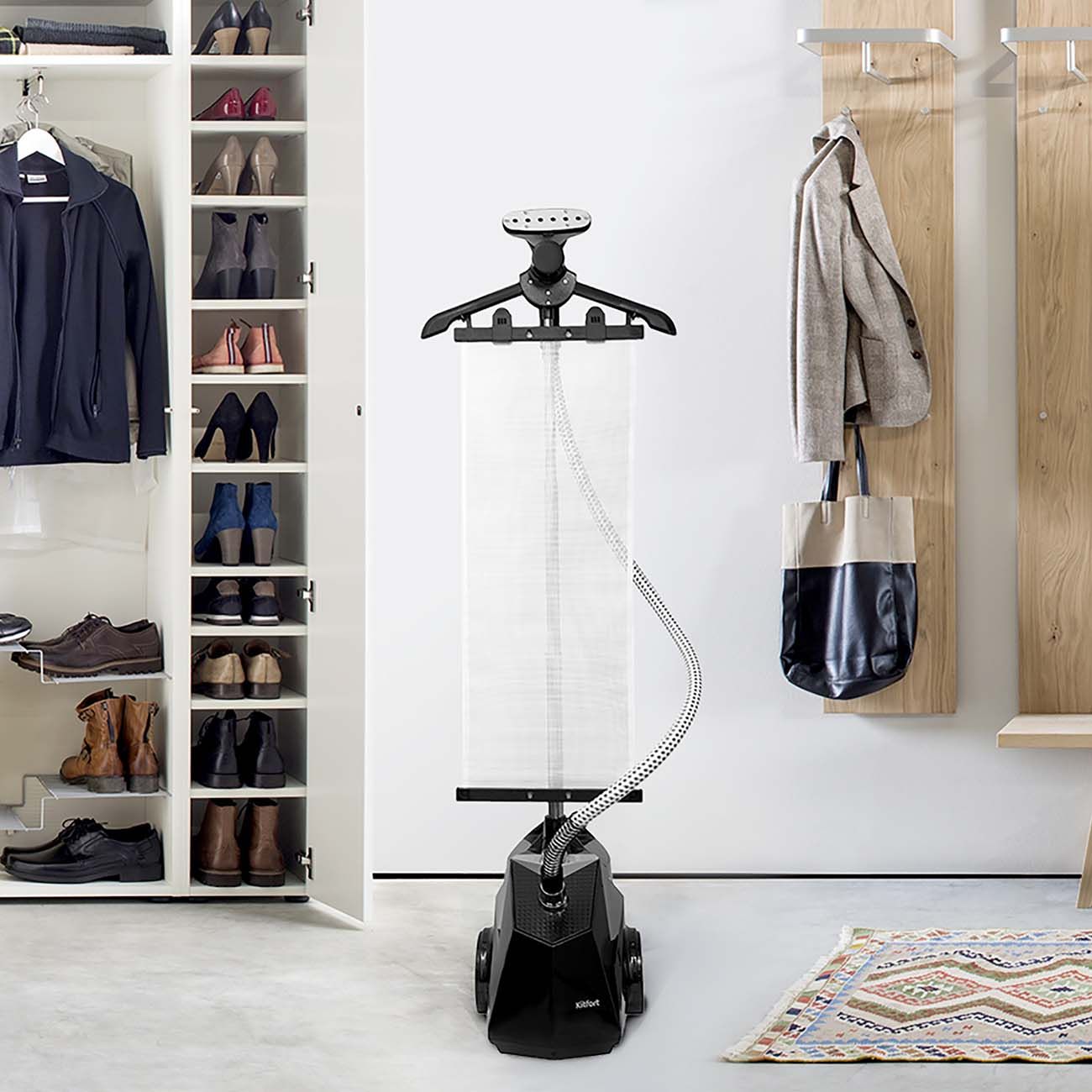 На вешалке фиксируется вертикальное полотно, которое обеспечивает Kitfort КТ-970 ещё большую эффективность. А предусмотренная в наборе варежка с тефлоновым покрытием защитит ваши руки от риска обжечься.
