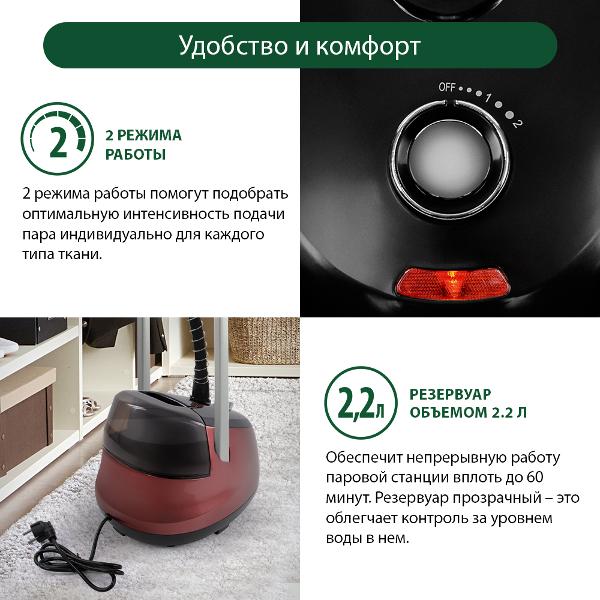 Отпариватель Marta MT-1161, бордовый оснащен двумя режимами подачи пара. Прибор предназначен для напольной установки. Интенсивность отпаривания — до 35 г/мин. Установлен съемный резервуар для воды объемом 2,2 л. Он изготовлен из пластика. Длина парового шланга составляет 1,2 м. Модель работает от электросети и потребляет 230 Вт. Длина сетевого кабеля — 1,25 м.