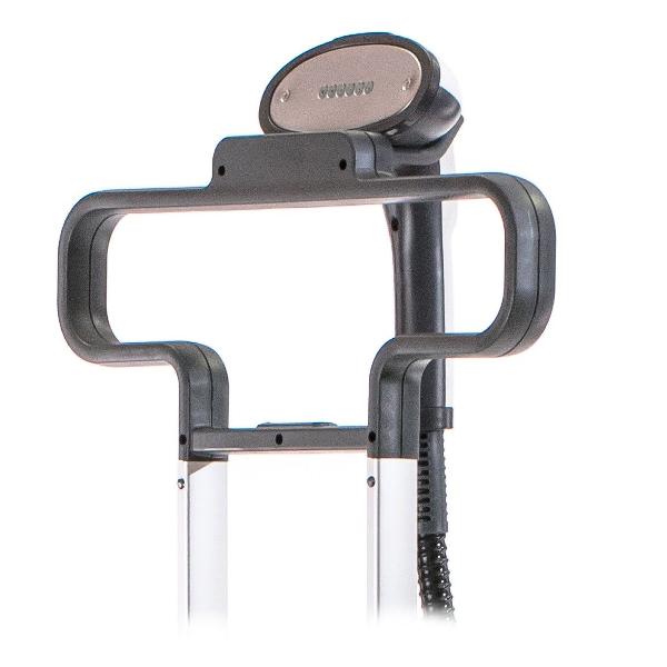 Устройство оснащено утюжком с подошвой 14,5х5,5 см. В приборе реализована механическая система управления. Для подключения к розетке используется сетевой шнур 1,7 м. Корпус изготовлен из пластика и дополнен телескопической стойкой. В комплект входят чехол, насадка-щетка, аксессуар для стрелок. Размеры — 28х28,5х36 см, вес — 6,1 кг.