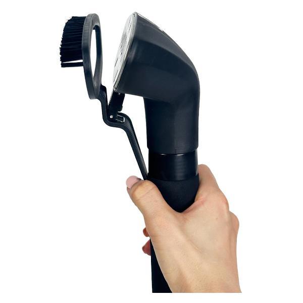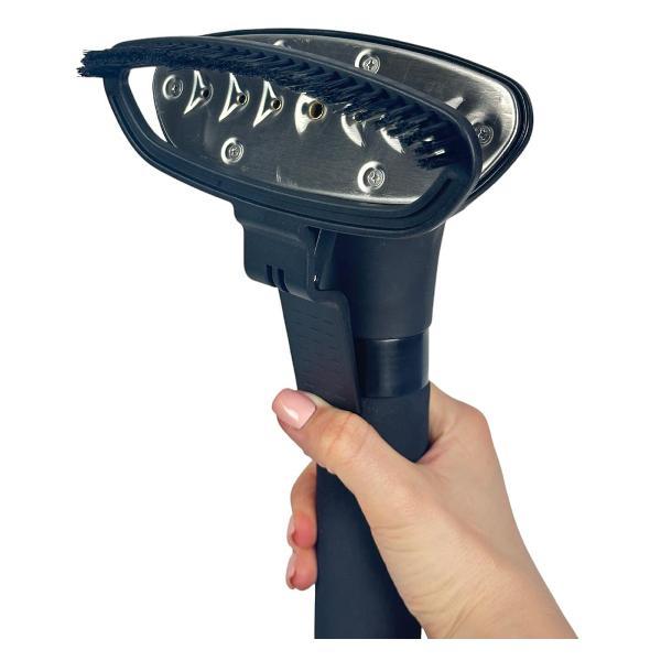 Отпариватель готов к работе через 45 секунд после включения. Работает от сети, оснащен шнуром питания длиной 1,85 м. Модель функционирует в одном температурном режиме и поддерживает функцию автоотключения. В комплект входят насадка-щетка, вешалка для одежды, защитная рукавица, крюк-держатель.