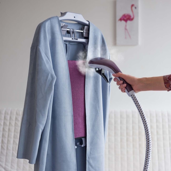 Корпус прибора сделан из пластика, подошва утюжка — из металла. Высоту стойки легко регулировать за счет телескопического механизма. Предусмотрен фиксатор для шланга, держатели для юбок и брюк. Эта модель оснащена компактной гладильной доской для вертикального и горизонтального использования, вешалкой, защитной рукавицей. В комплект входит насадка-щетка. Потребляемая мощность отпаривателя — 1900 Вт, длина сетевого кабеля — 1,3 м.