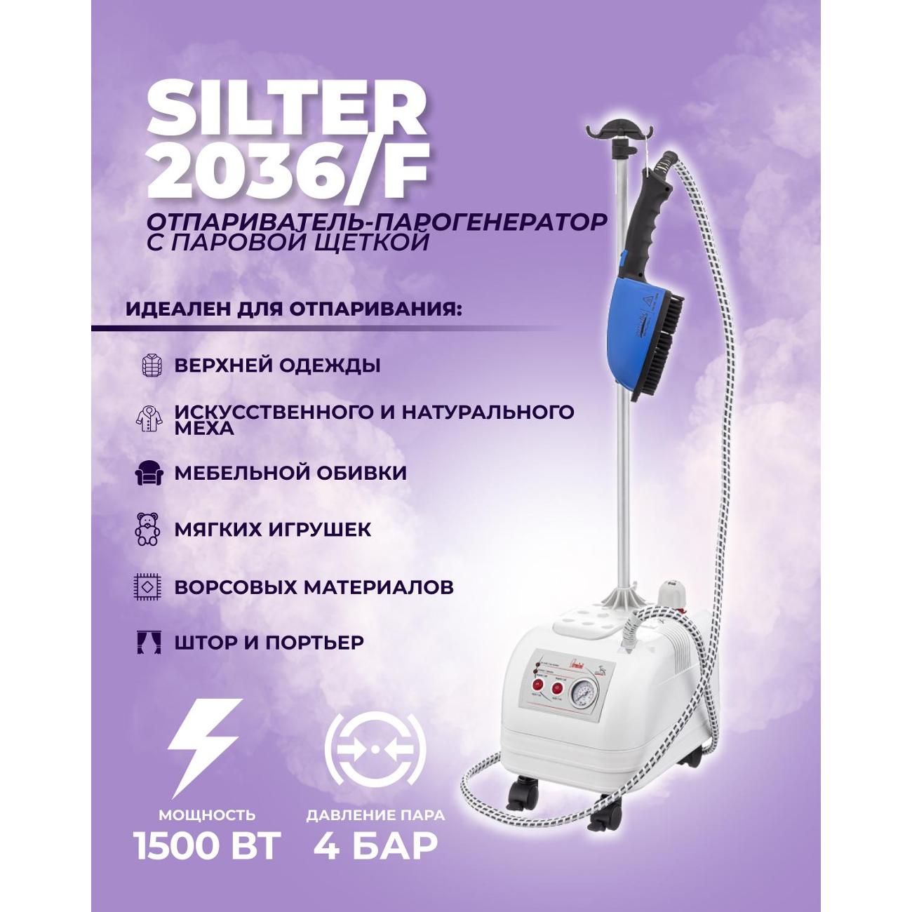 Отпариватель Silter 2036 F оснащен четырехступенчатой системой защиты от перегрева с функцией автоматического отключения питания при появлении неполадок. Корпус модели выполнен из термопластика. Длина сетевого кабеля равна 2 м. Предельный показатель энергопотребления не превышает 1500 Вт. Тип управления — механический.