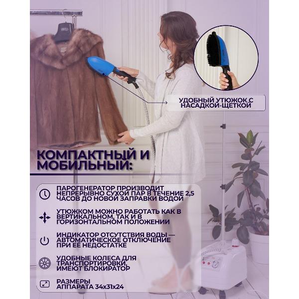 Рабочее давление устройства — 4 бар. Отпариватель подойдет для быстрого разглаживания различных типов материалов в вертикальном положении. Время нагрева до рабочего состояния не превышает 10 минут. Встроены индикаторы готовности к работе и отсутствия воды. В комплект поставки входят воронка, мерный стакан и насадка-щетка. Сила парового удара составляет 5 г/мин. Максимальная температура равна 220°C.